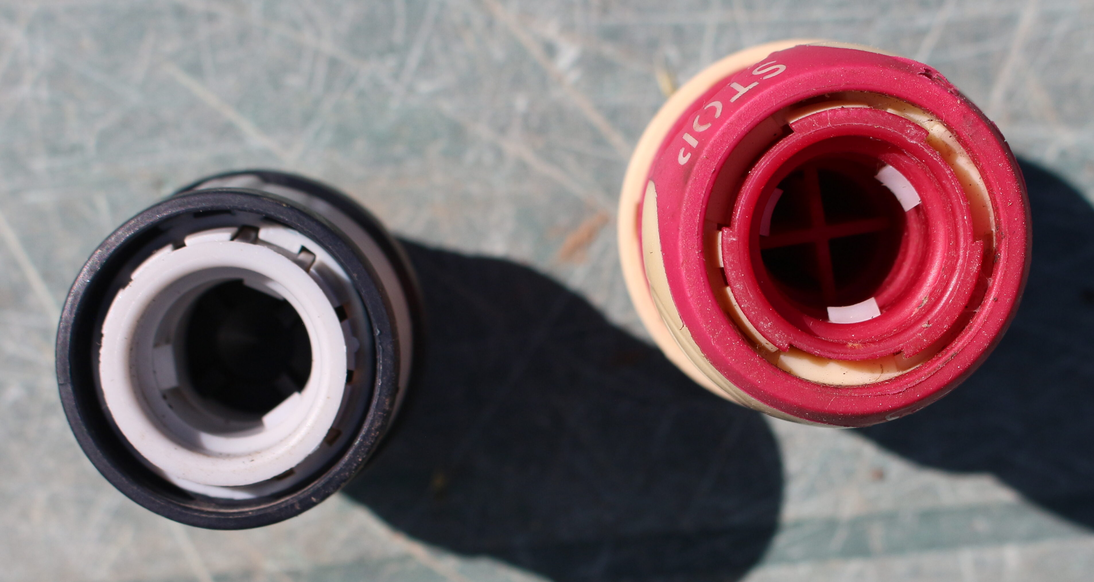 Обычно коннекторы с клапаном имеют надпись STOP, чтобы отличить их от других, но можно посмотреть на просвет, клапан перекрывает сечение.