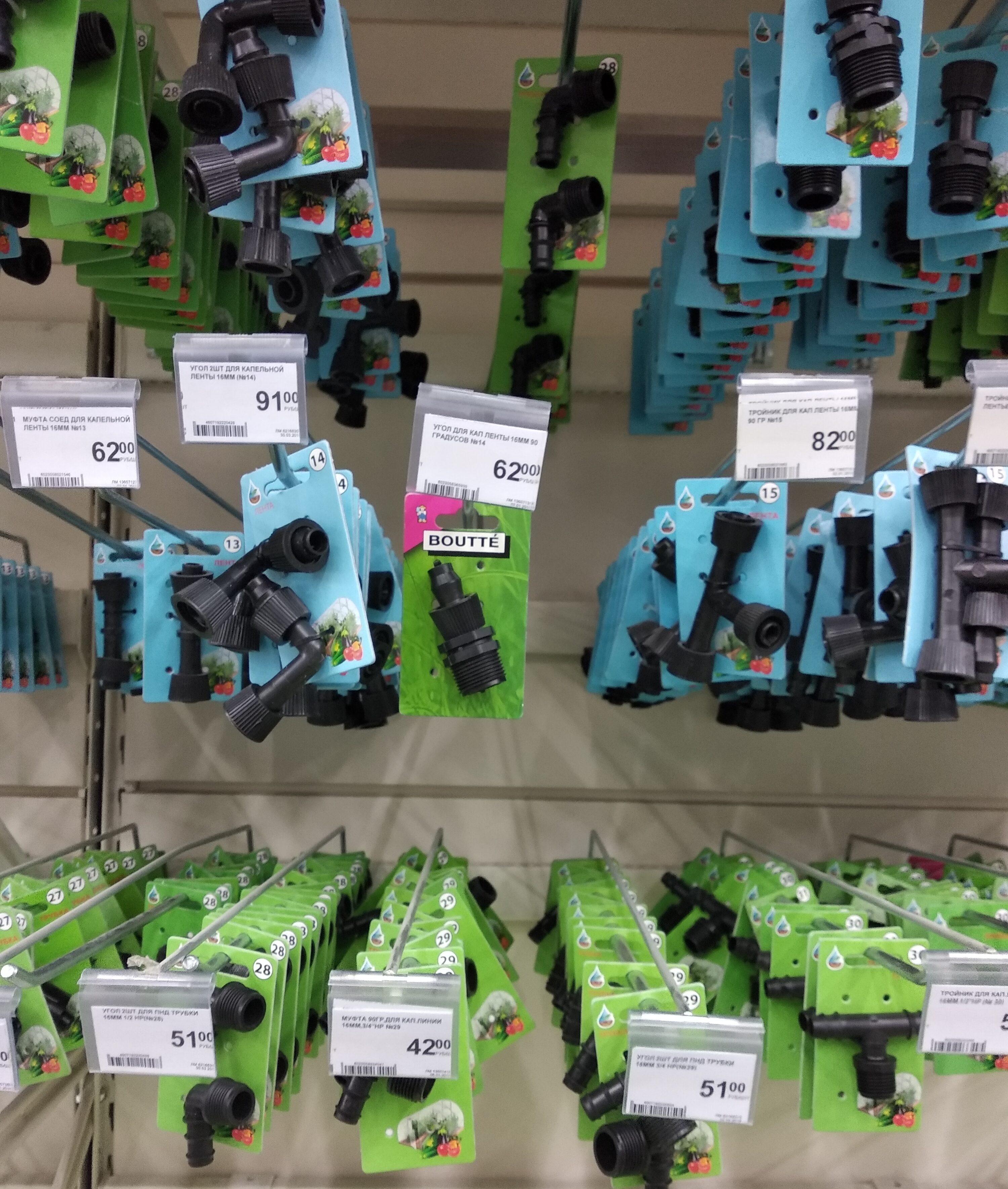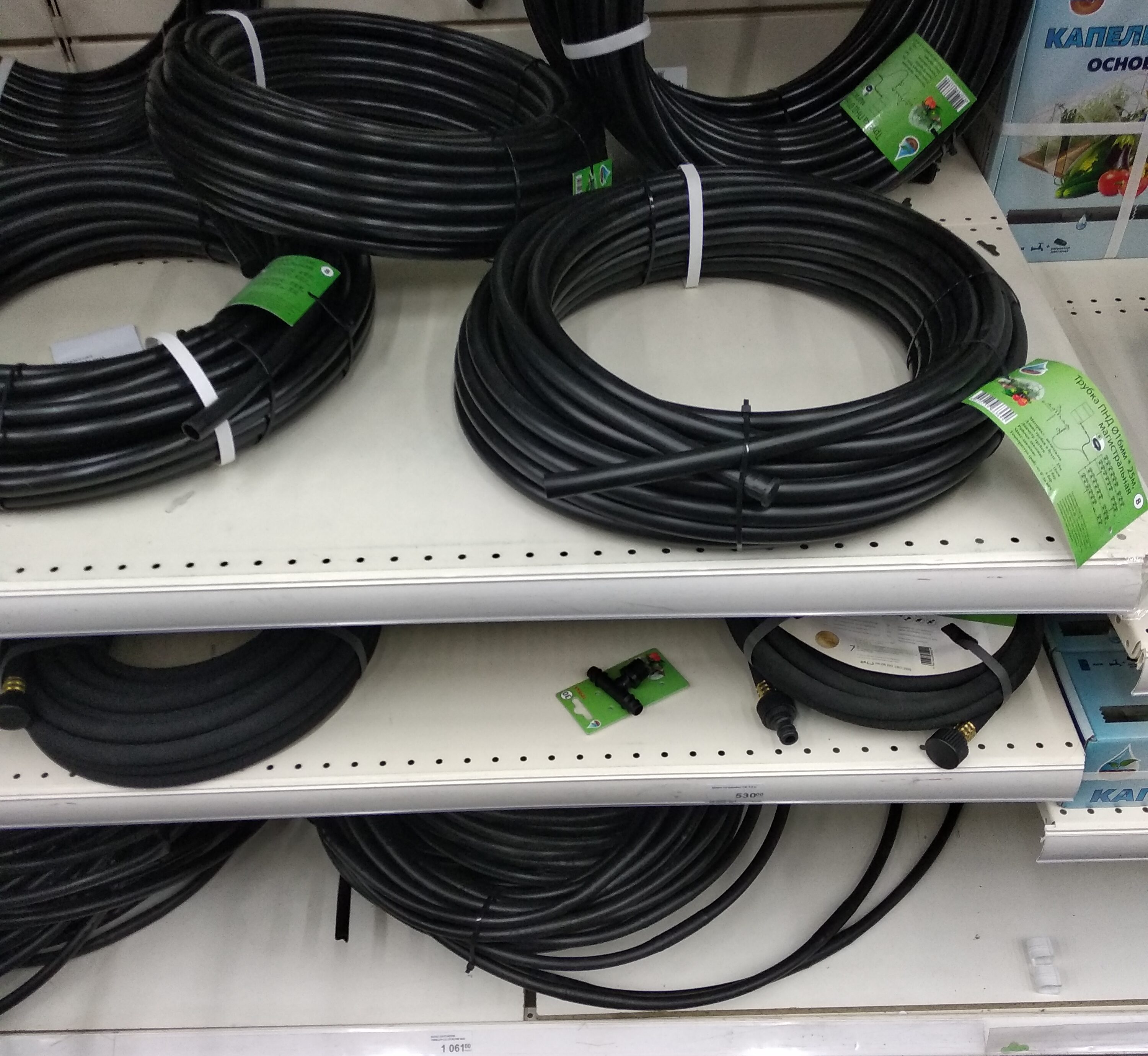 Для удобства монтажа шлангов есть много различных переходников, тройников, углов и прочих нужных деталей. Капельные шланги тоже имеют разные конструкции. Обычно это круглые трубки диаметром около 16 мм, в которые вмонтированы капельницы через определённые промежутки. Расстояния между капельницами могут начинаться от 20 и доходить до 40 см.