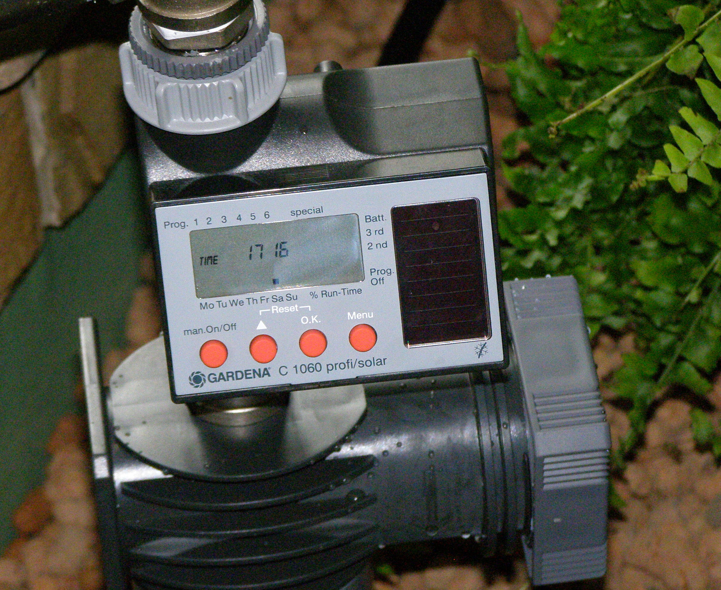 Можно немного усложнить саму систему, но при этом упростить работу в саду. Достаточно поставить в линию «кран-шланг» простейший управляющий контроллер с электромагнитным клапаном и распределитель направления воды, и вот у нас уже автоматическое управление всем поливом в наше отсутствие.