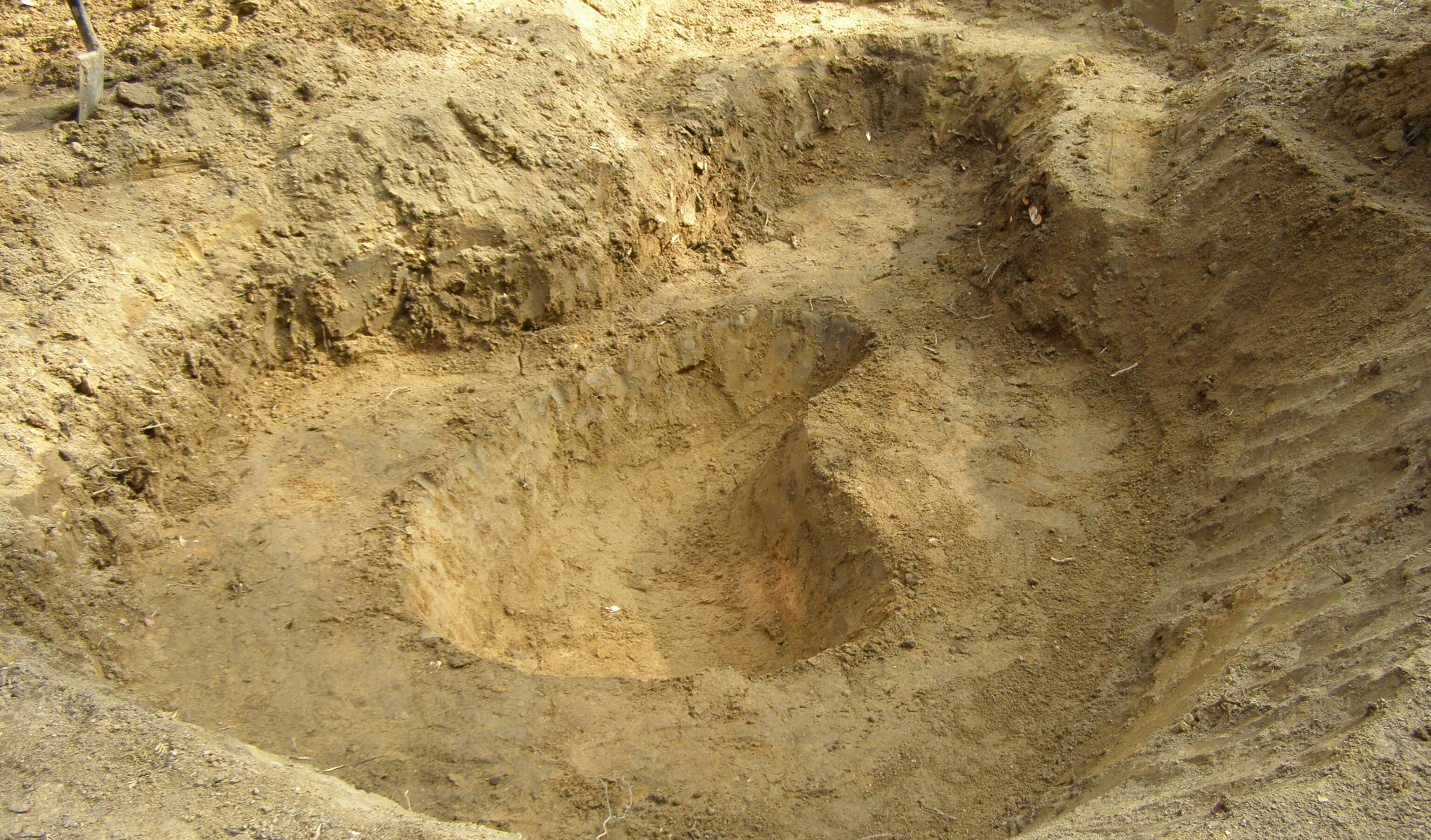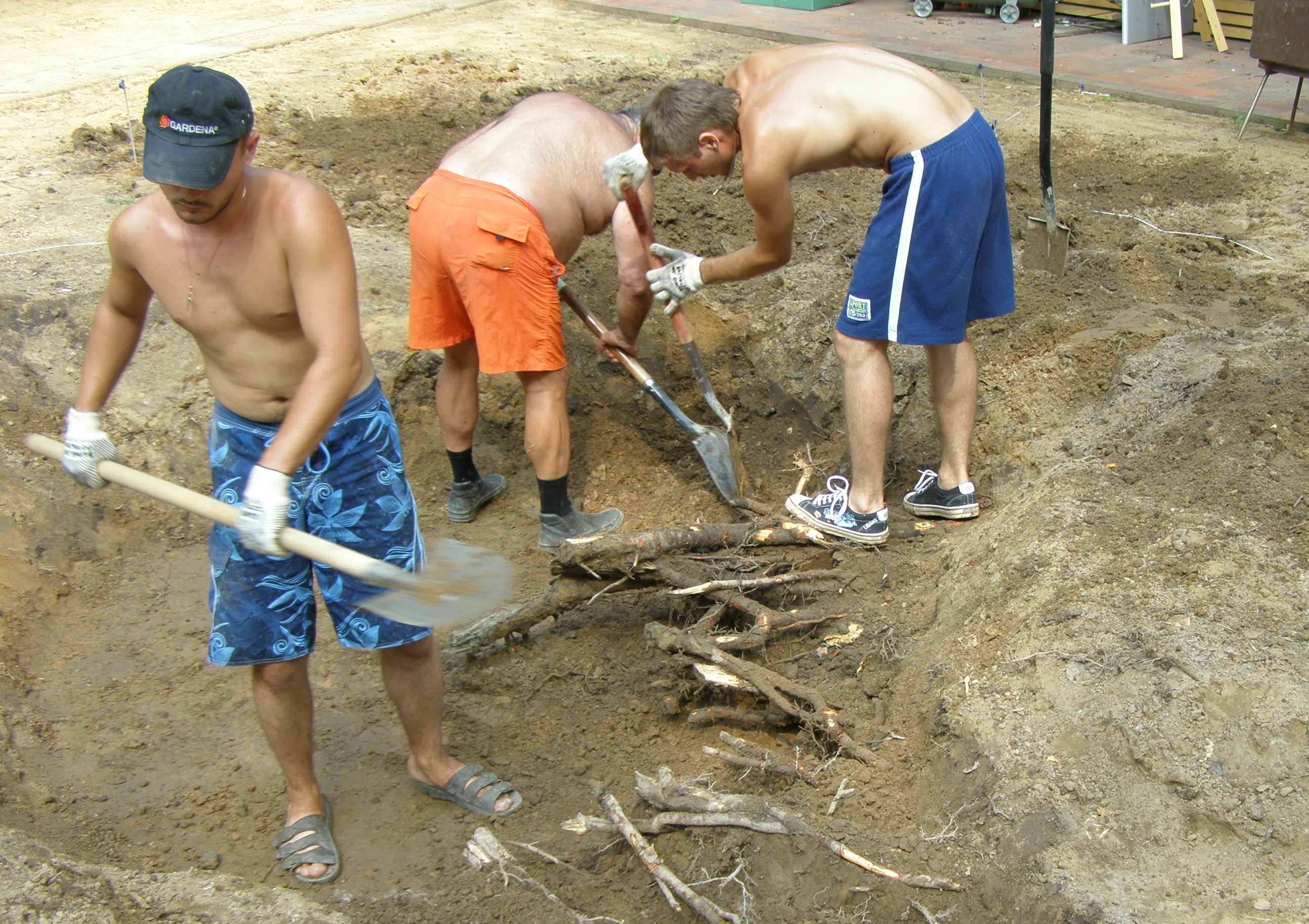 Первым делом надо снять верхний слой грунта (если он плодородный, то его складывают отдельно для дальнейшего использования) или газона. Постепенно углубляя дно, котловану придаётся нужная конфигурация. Если Вы хотите декоративный пруд, то конечно надо использовать больше ступеней и перепадов дна для большей декоративности.