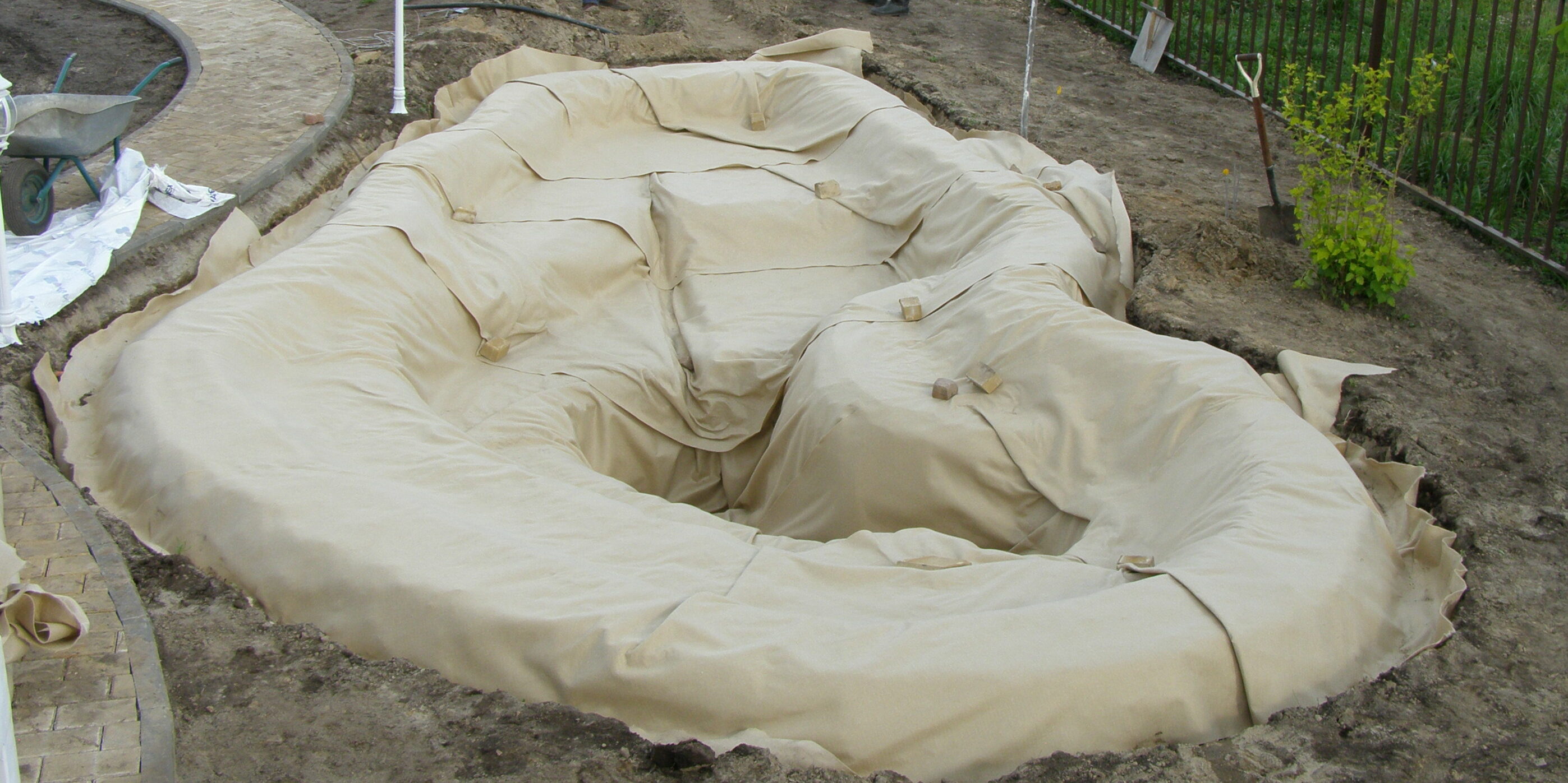 Закладка водоёма начинается с выбора места под него. Этим должен заниматься специалист. Выбранное место отмечается шпагатом, шлангом или колышками. Можно нарисовать овал пруда с помощью аэрозольной краски прямо на поверхности площадки и потом откорректировать.
