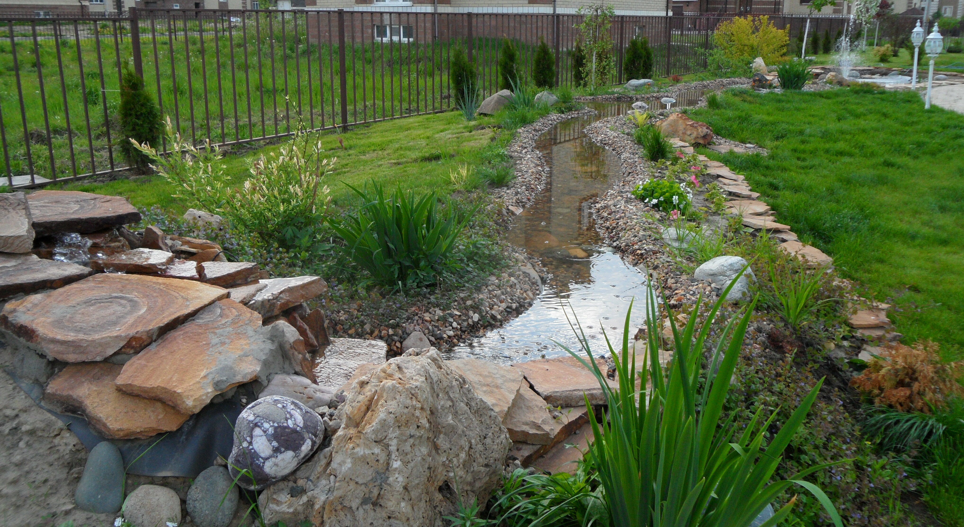 В одном из предыдущих материалов говорилось о перемещении больших объёмов земли при работе над прудом. То же самое относится и к ручьям, и каскадам. Идеальный вариант, когда участок имеет уклон в нужную сторону и перепад высот позволяет построить русло без дополнительных больших затрат.