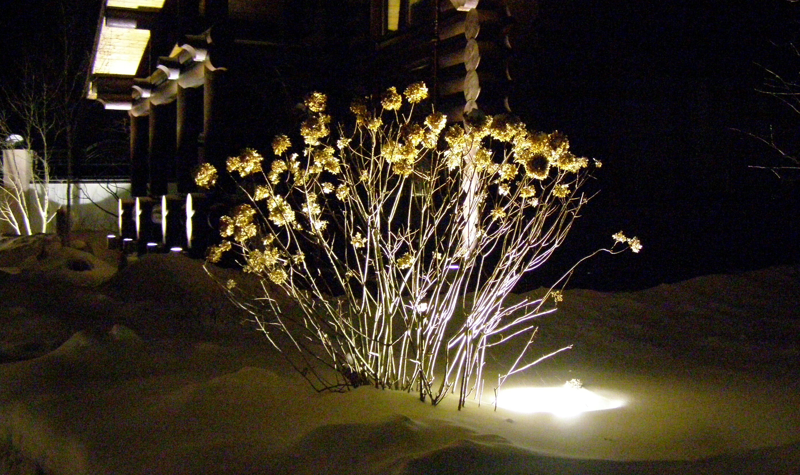 Можно условно разделить подсветку деревьев на две категории: «плоды» и «листья». К первому классу относятся достаточно крупные, редко расположенные фонарики, которые создают впечатление, что крона дерева заполнена светящимися в темноте плодами. В этом случае мы рекомендуем использовать достаточно яркие (не по силе света, а по оттенку), теплые цвета – оранжевый, желтый, красный.