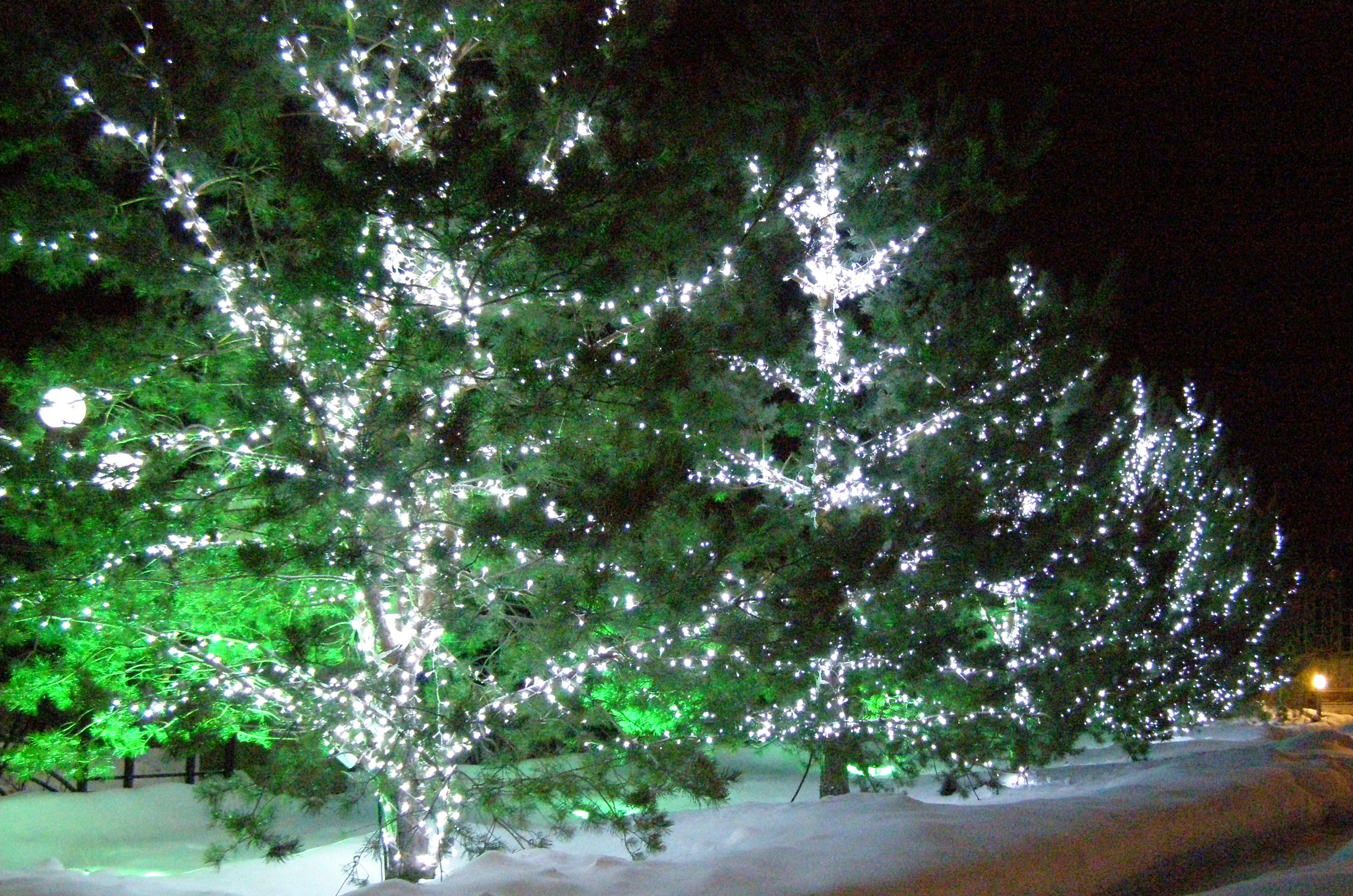 К второму классу относятся гирлянды с мелкими лампочками, которые более часто расположены – они создают эффект светящихся листьев. В этом случае более уместны другие цвета — такие как зеленый, синий, фиолетовый, а интенсивность их свечения должна быть на минимально уровне. Темная крона дерева, теряющая очертания на фоне темного же неба, обретает объем, когда она умело освещена.