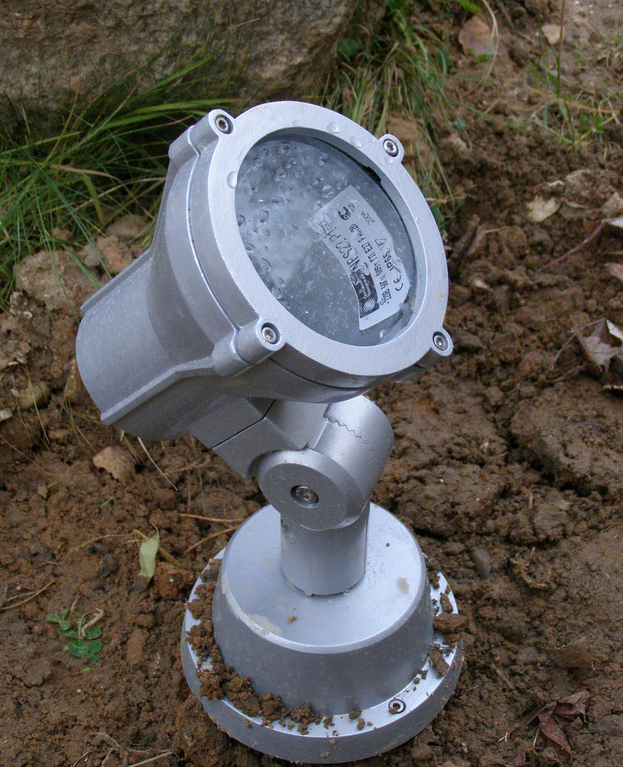 Цвета черный, серебристый. Крепится к стене или бетонному фундаменту на скобе. В последнее время часто применяются светодиодные источники на пониженное напряжение с цветными светофильтрами или с RGB матрицей и динамическим контроллером, создающим неповторимую игру цветов.