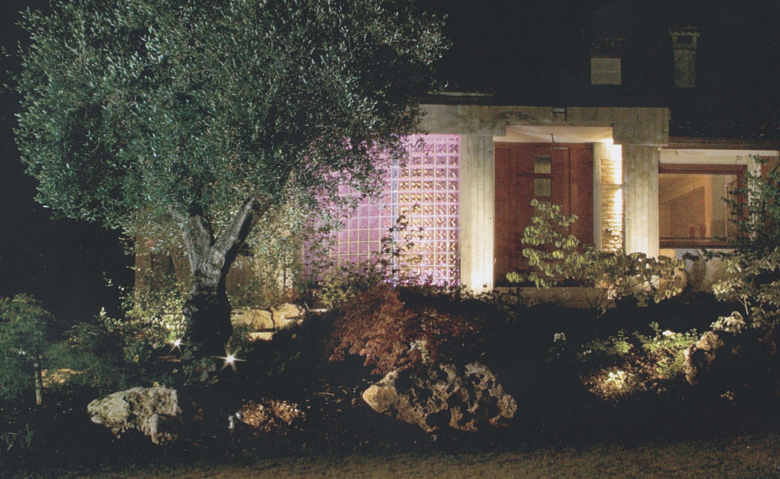 Подсветка с земли вызывает своеобразный эффект от густых крон деревьев. Создается такое освещение при помощи утопленных в землю или расположенных на ее поверхности прожекторов и ламп (прожектора создадут эффект заливки светом, а маломощные светильники способны подчеркнуть силуэт).
