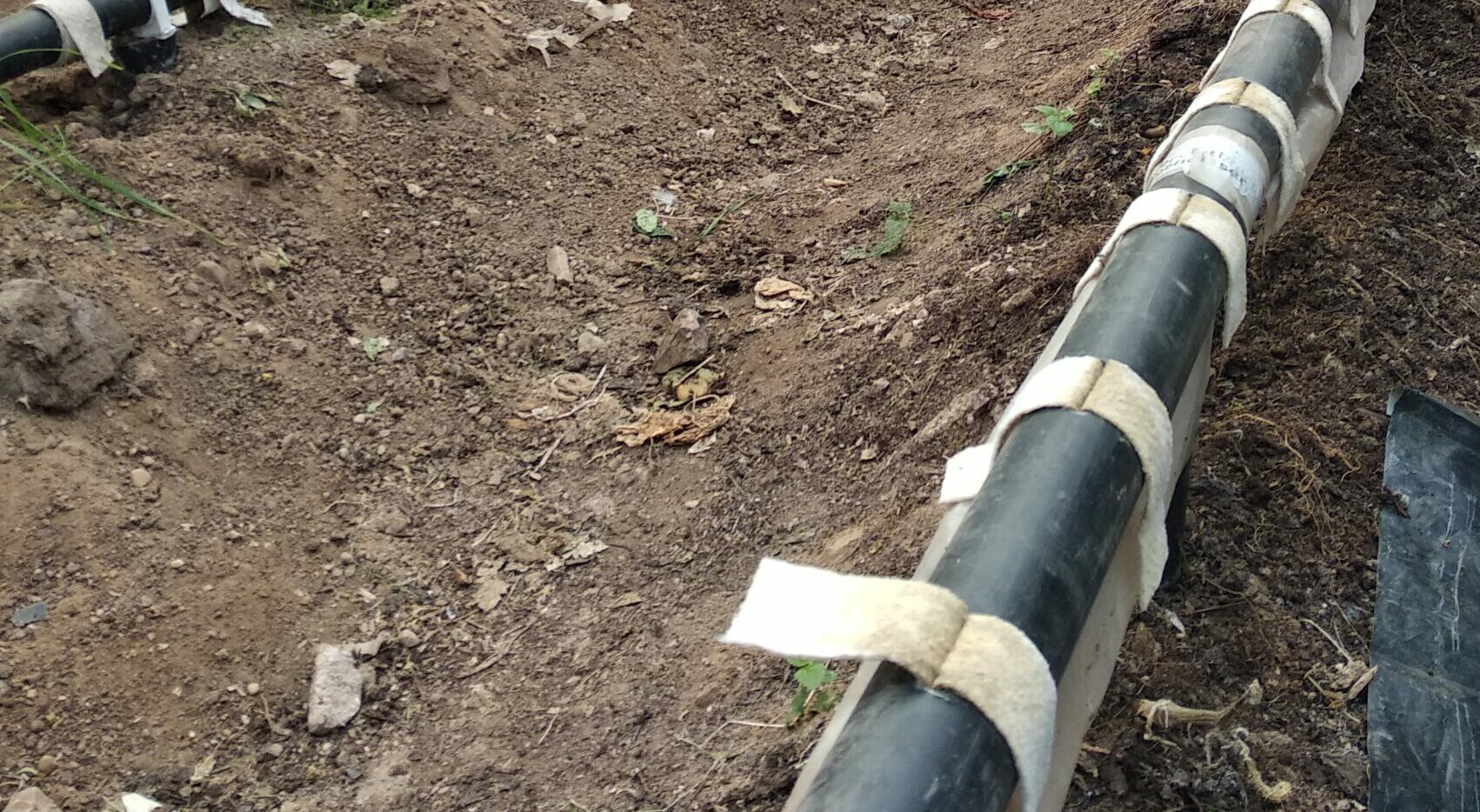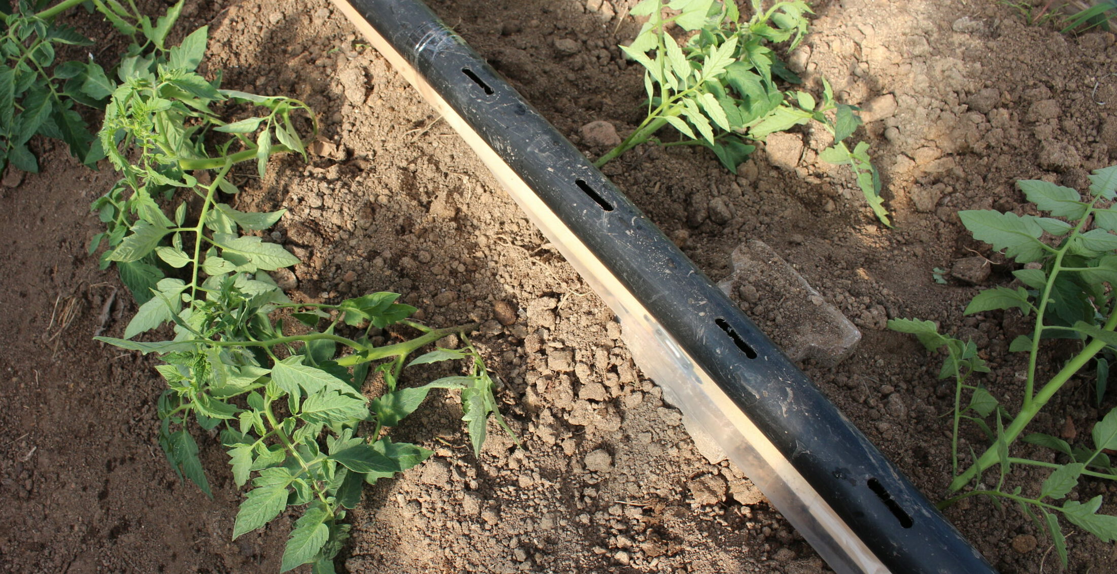 Основа для этой капельной системы – ровная доска или брусок подходящего размера. На это основание укладывается труба из ПНД диаметром примерно 60мм и закрепляется в хомутах. Главное условие — строгая горизонтальность всей установки.