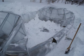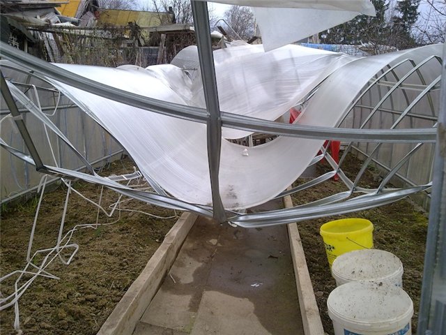 Пленка обычная и даже армированная наверняка не выдержит такую нагрузку и разрушится. Сотовый поликарбонат 4 мм может устоять, но скорее всего, деформируется вместе с каркасом (фото вверху). В случае с ветром, а сильный может давить на каркас с силой до 17 кг/м2 , ураган давит уже с силой до 95 кг/м2 — эта дополнительная нагрузка на каркас может доставить Вам много хлопот.