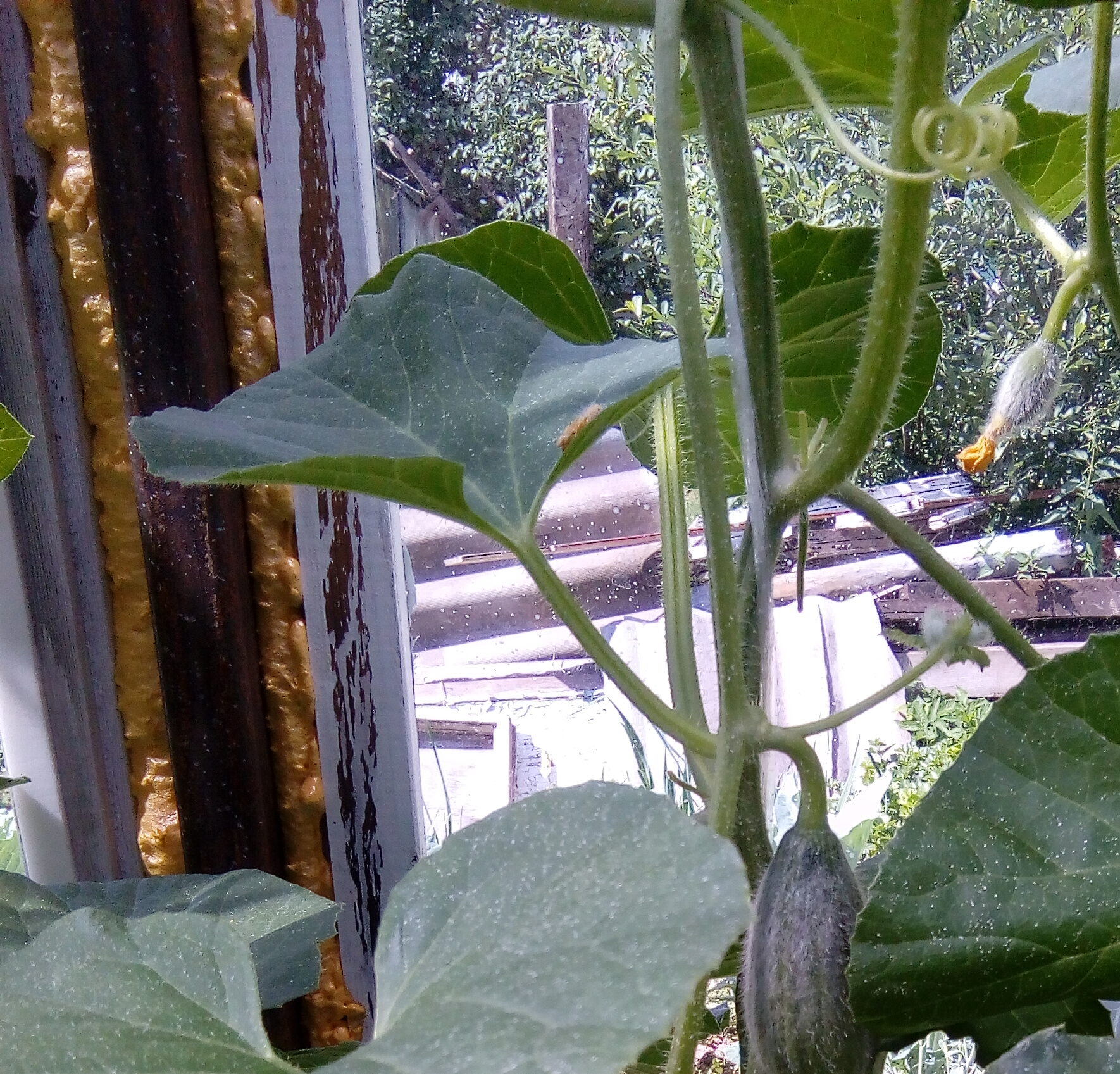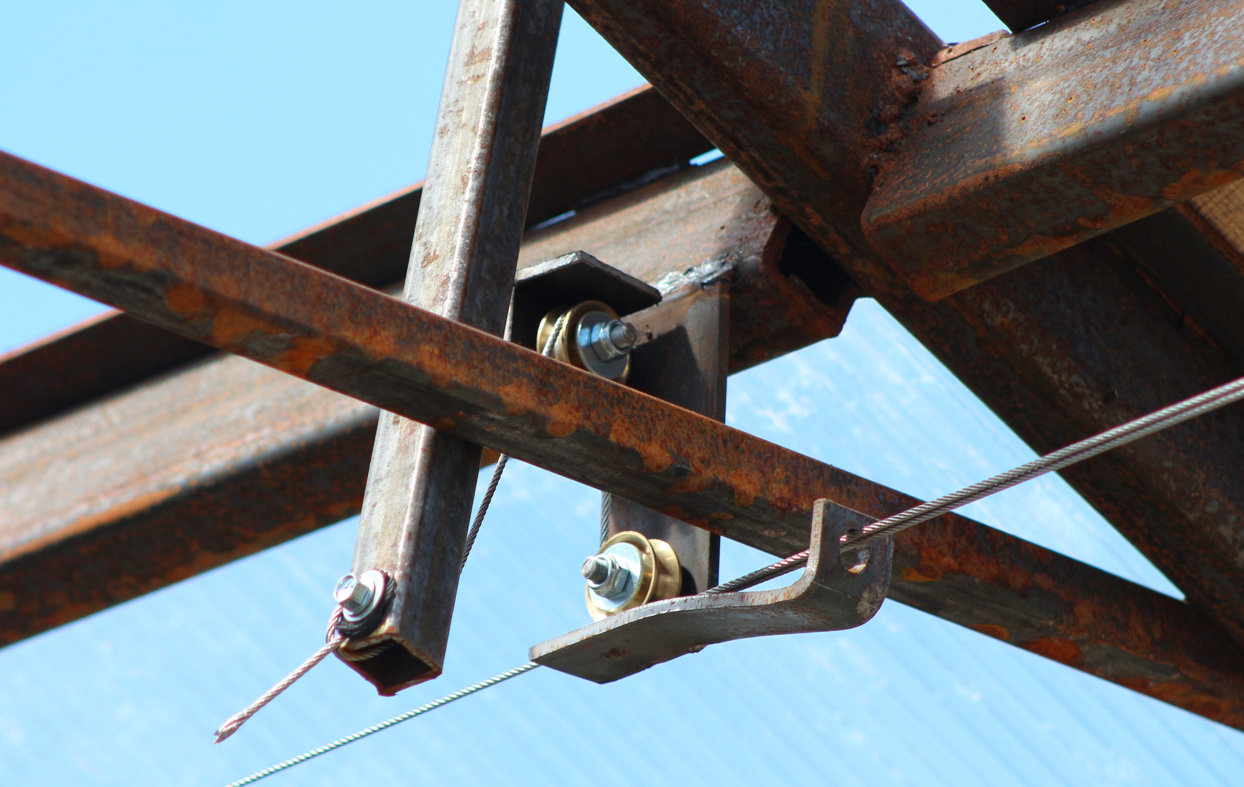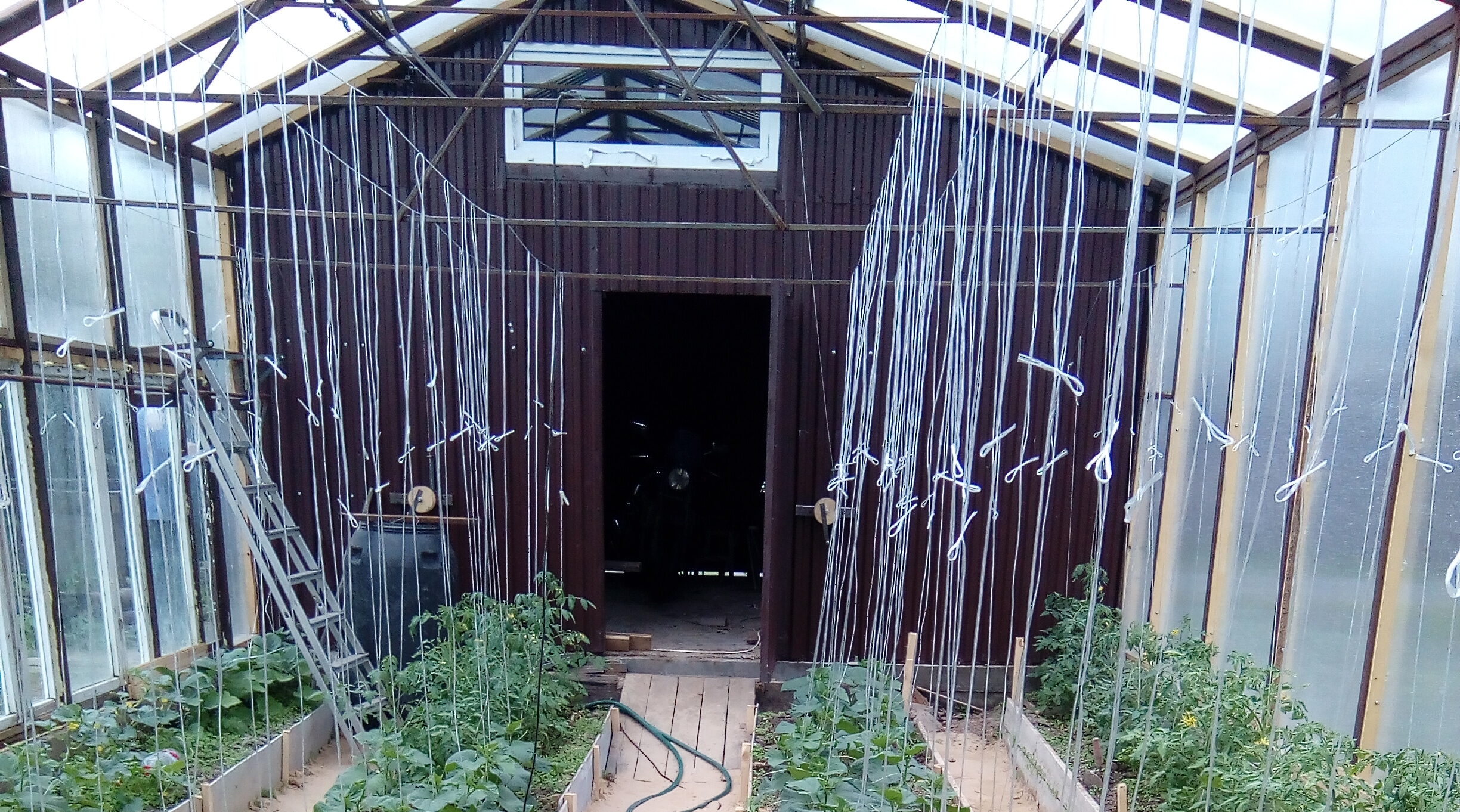 Для подвязки растений была реализована шпалерная система. Продольные шпалеры были сделаны из стального тросика диаметром 3 мм в пластиковой оболочке. Одним концом они крепились к стенке гаража на крючки, а другой — к кирпичной стенке сарая с помощью натяжного устройства (талрепа). Шпалеры опирались на несколько затяжек, приваренных к стойкам каркаса на высоте примерно 2.2 м от поверхности земли.