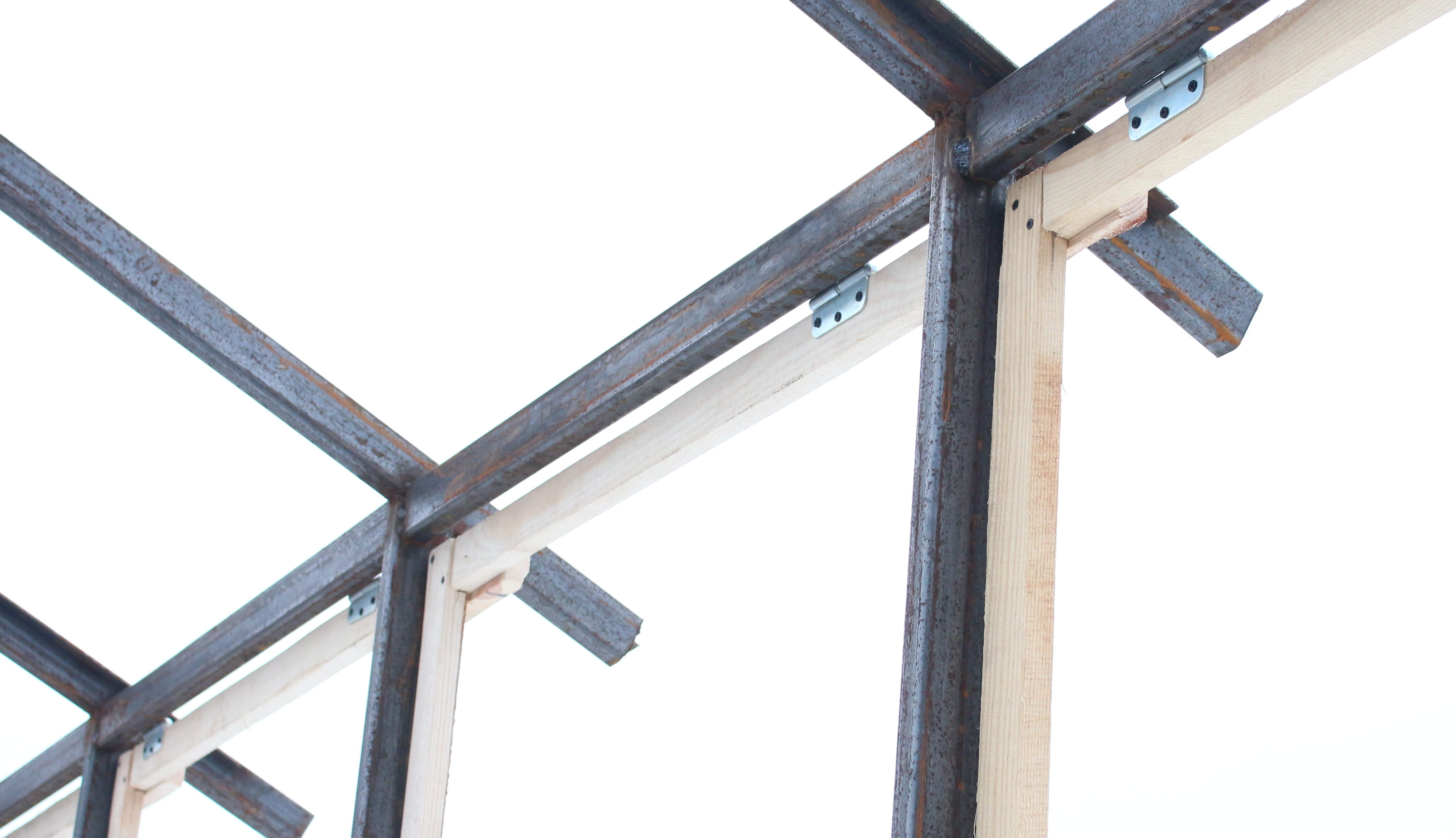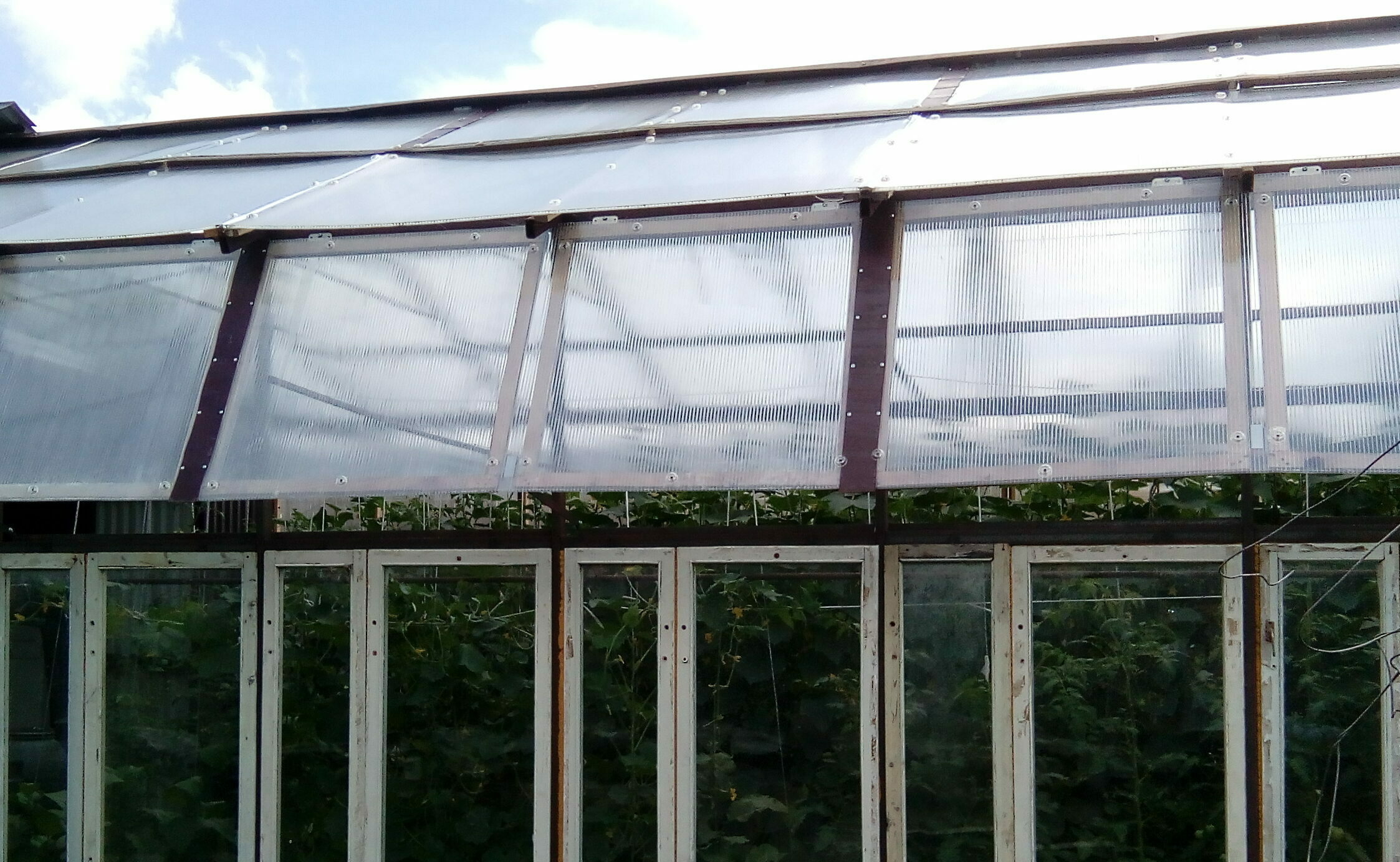 Поскольку каждая смежная пара фрамуг скреплялась одним куском поликарбоната шириной 2.1 м, то было решено оставить только три петли крепления. А каждая пара фрамуг уже соединялась между собой с помощью листовых накладок, и таким образом жёсткость всей конструкции оставалась надёжной. Точки приложения усилия для открывания фрамуг – боковой и шатровых – распределялись равномерно по длине теплицы.