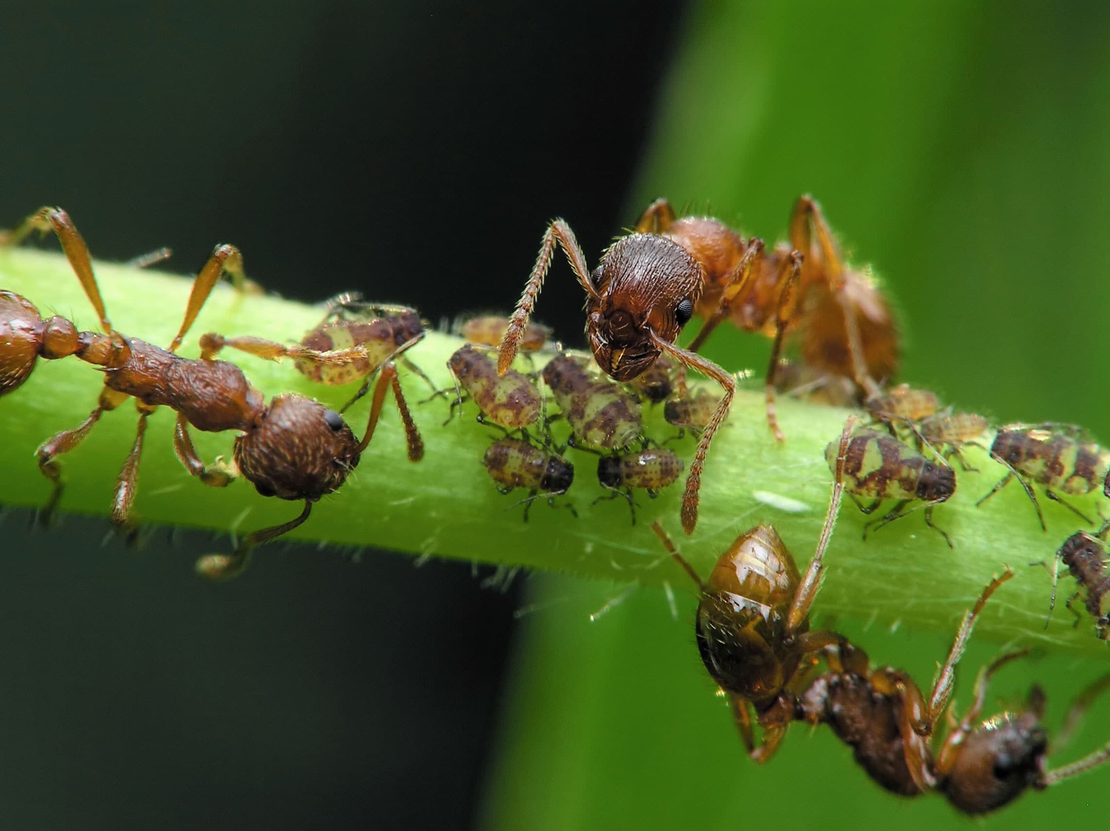 Часто муравьи охраняют насекомых вредителей – тлей, щитовок – для сбора сладких выделений этих вредителей. Есть выражение – муравьи пасут тлей.