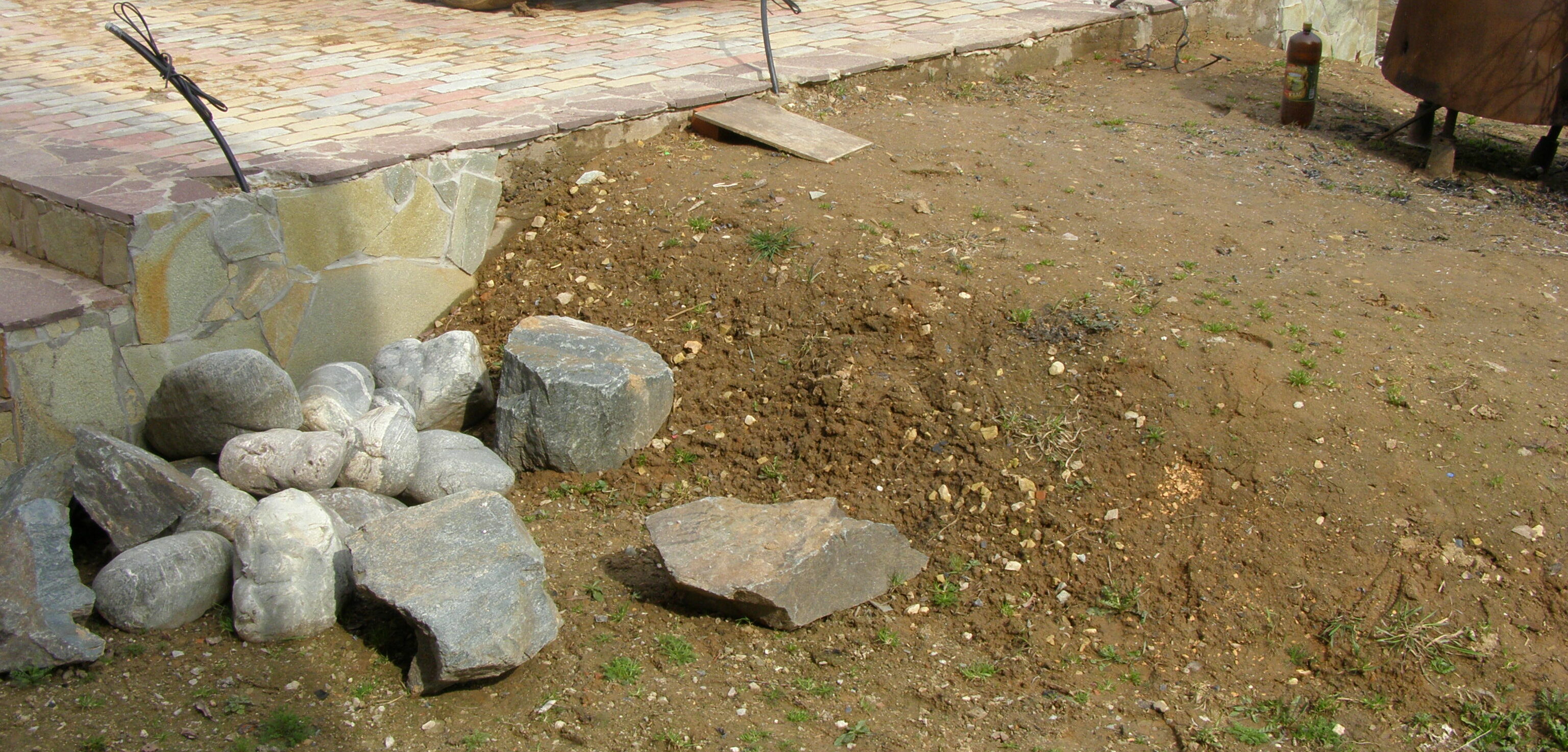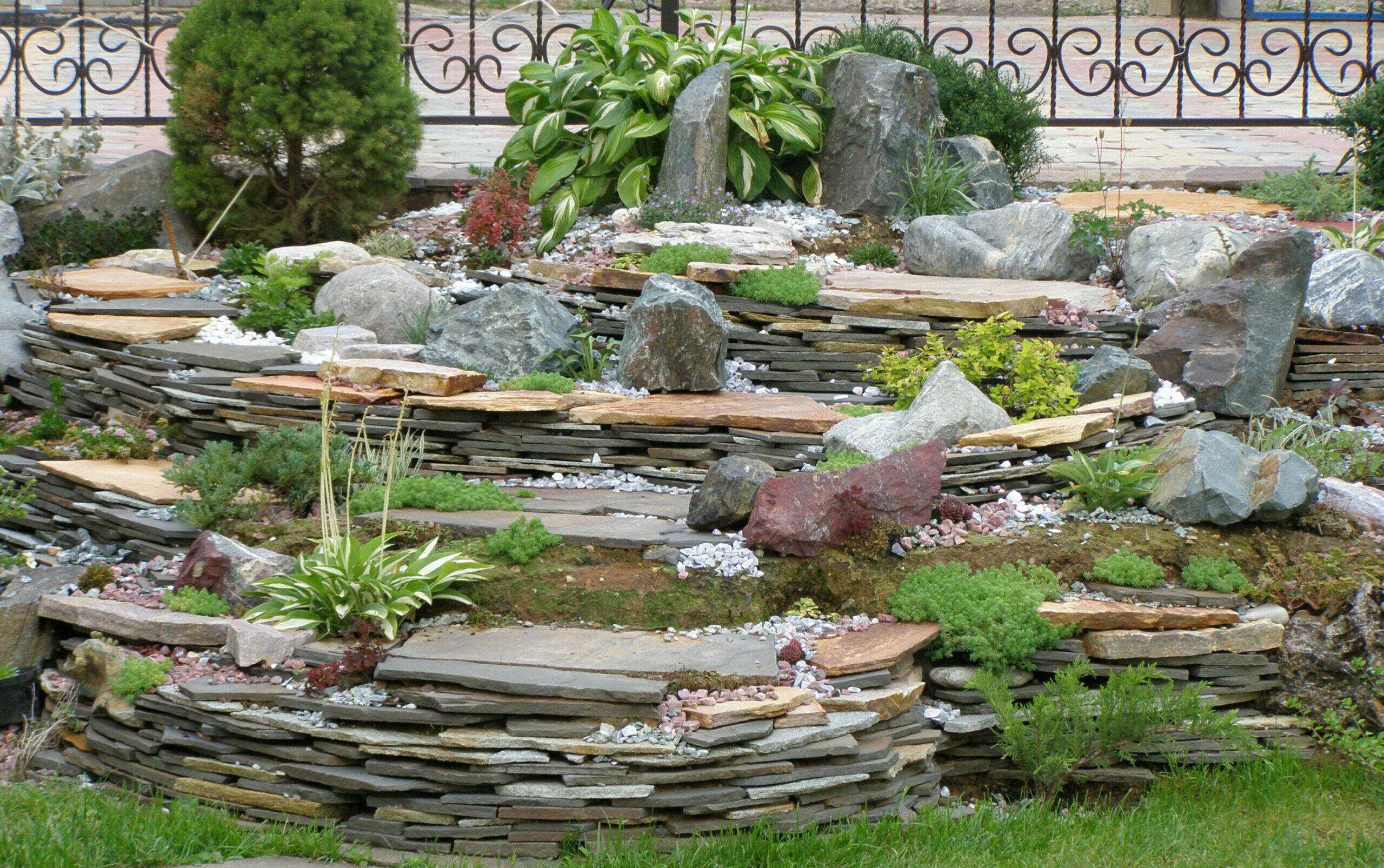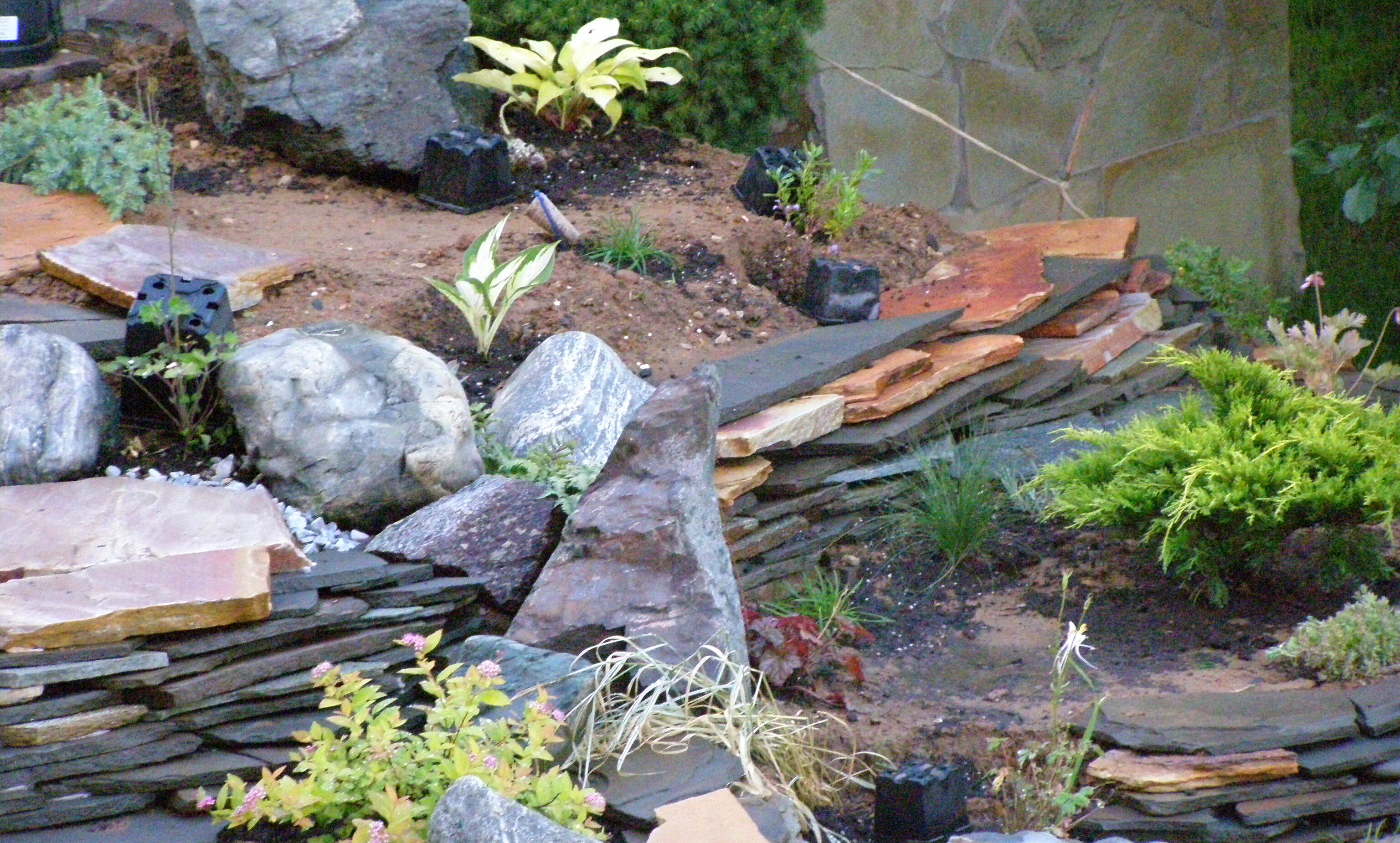 Но по прошествии некоторого времени это нечто превращается в кое-что. Для этого куче придается форма будущего произведения, организуются посадочные места для растений. Дальше выкладываются подпорные стенки, укладываются камни и вот, в результате, получается конечный продукт.