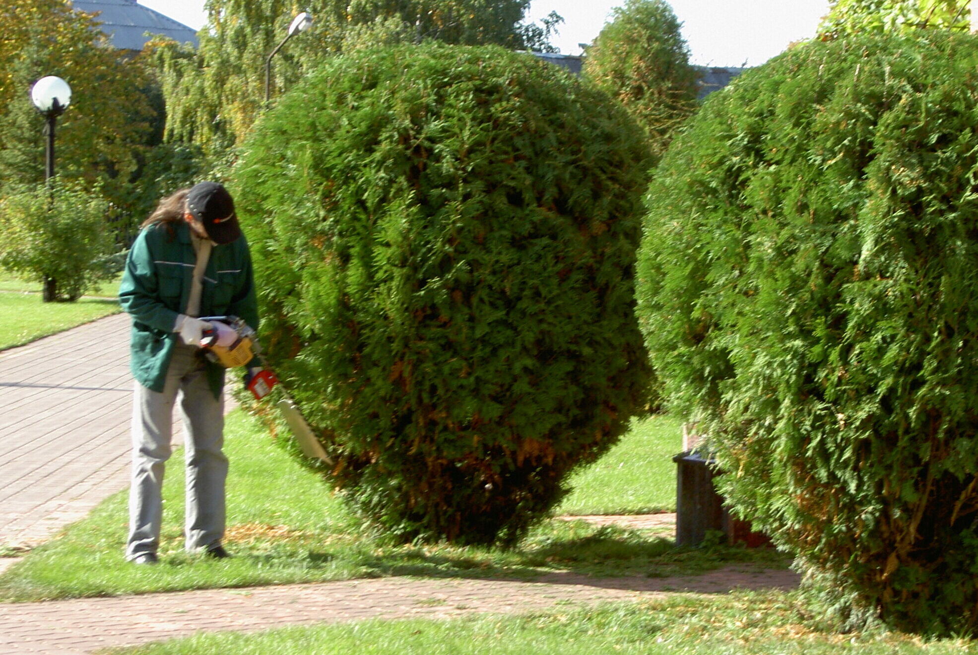 Для поддержания высоты на одном уровне проводят подрезку верха шпалеры (ножницы, секаторы) и подравнивают плоскости до заданной толщины – обычно не более 30см.