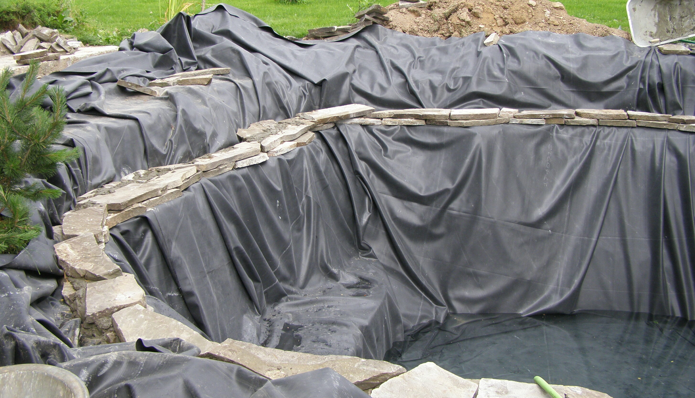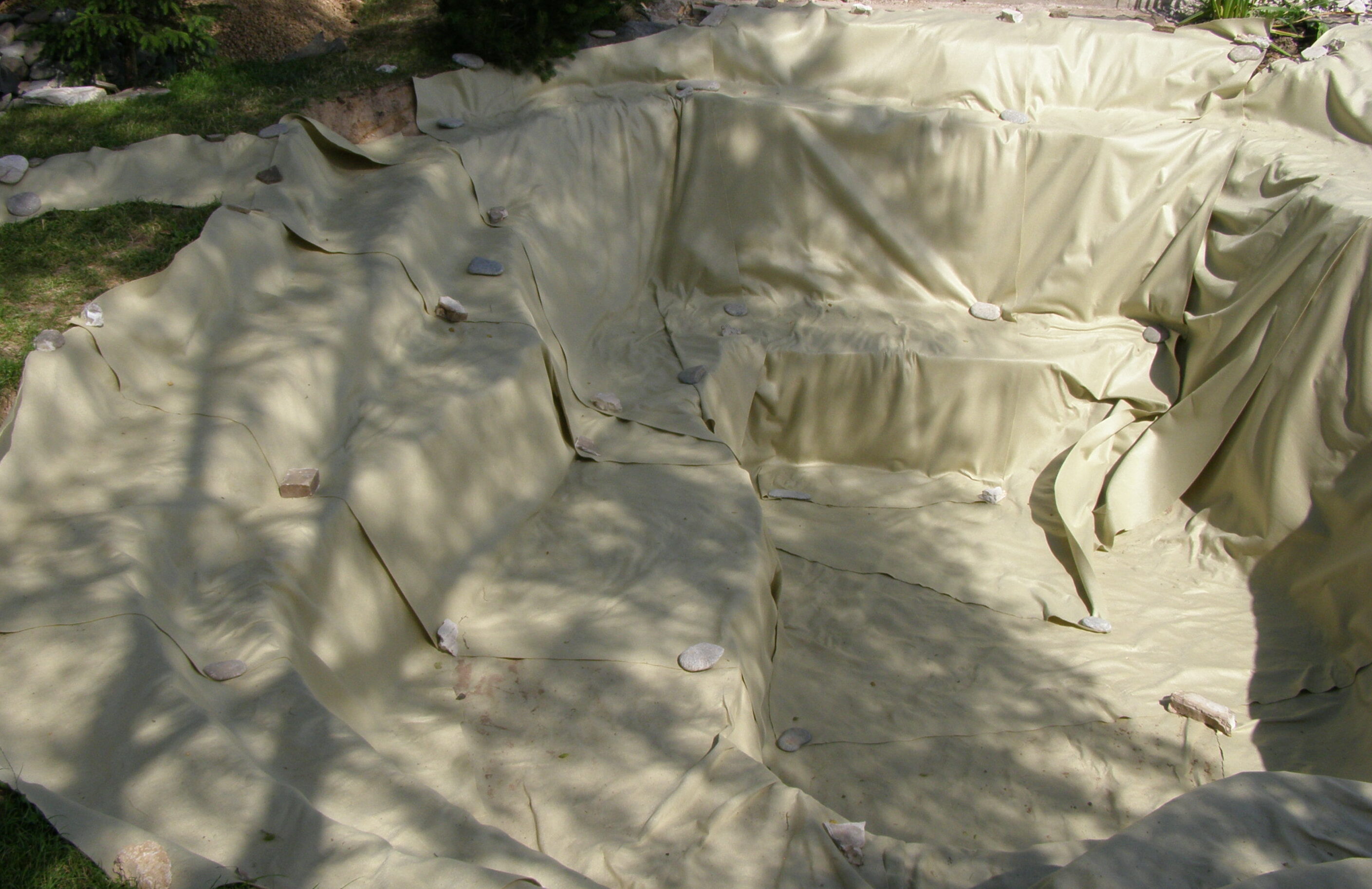 После полного оконтуривания водоёма подравниваются неровности, поверхность уплотняется и выстилается защитным текстильным покрытием с плотностью не менее 300г/м2. На него укладывается плёнка и тоже выравнивается. Верхний край плёнки должен иметь припуск на укладку в траншею и возможность засыпки её за пределами траншеи.