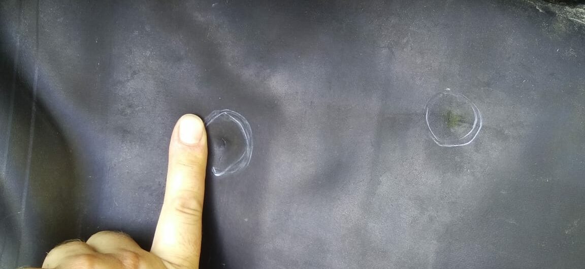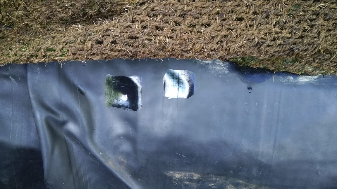 Придётся откачать ещё немного воды, чтобы определить место повреждения. Необходимо очистить поверхность плёнки от загрязнений и продуктов жизнедеятельности прудовой живности. Но найти место маленького прокола бывает не так легко, особенно если он образован вилами. Прудовые плёнки довольно эластичные материалы, особенно каучуковые.