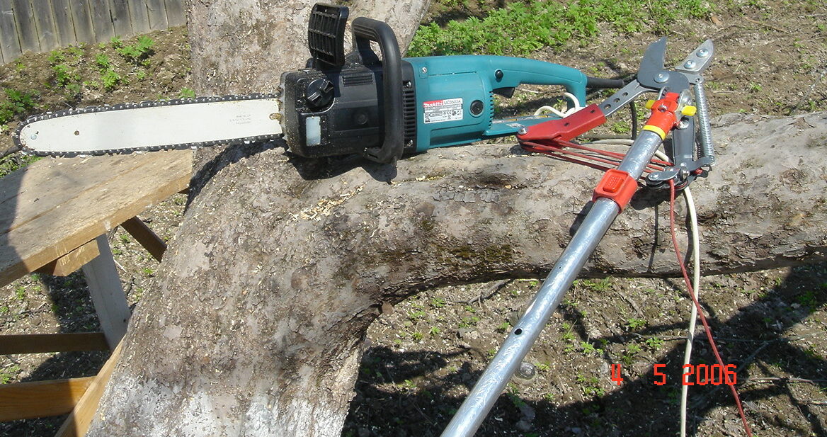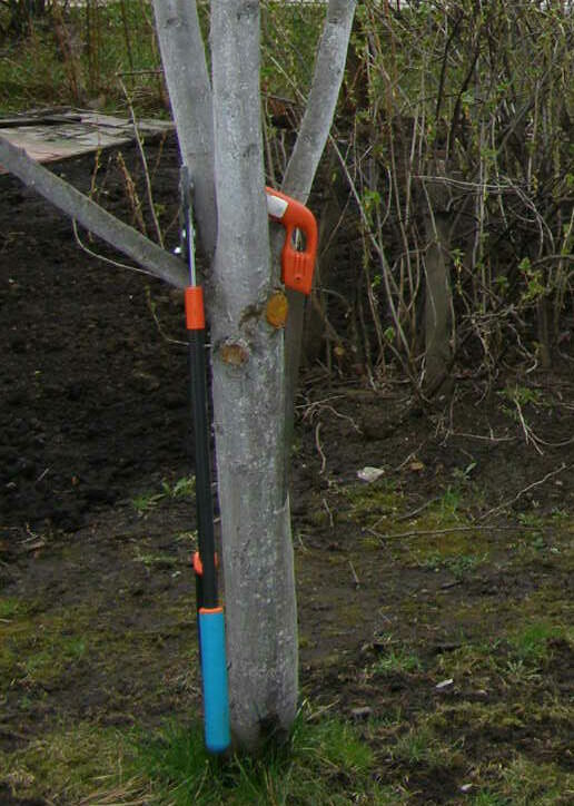 При высоте плодовых деревьев 5-6 метров в старых запущенных дачных садах – удобнее работать со стремянки (или стоя на толстых скелетных ветвях) двуручным сучкорезом или изогнутой ножовкой. Почему изогнутой?