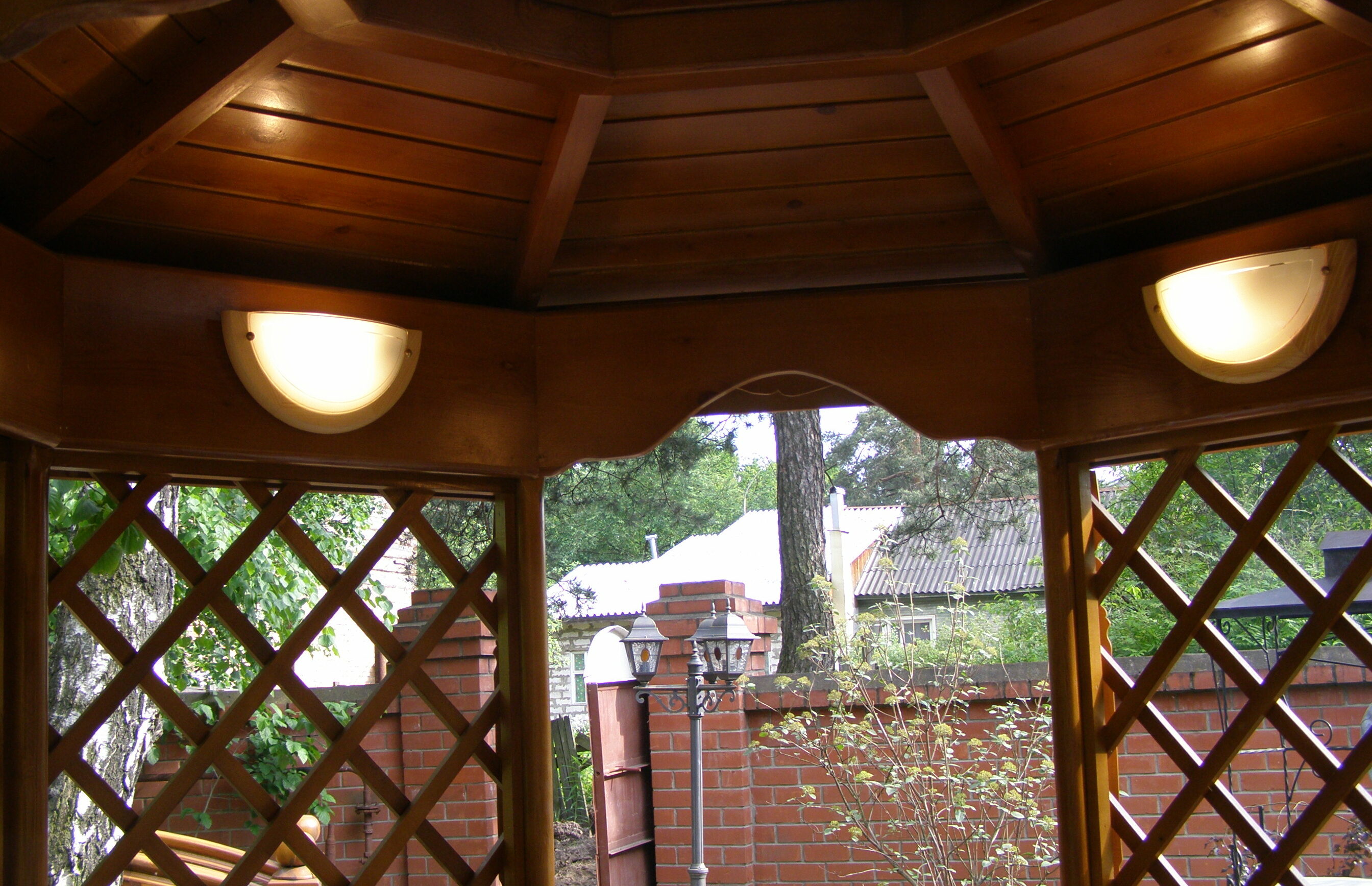 Внутреннее освещение беседки и веранды лучше всего делать двухуровневым. Первый уровень функциональный – для общего комфортного освещения, когда надо что-нибудь сделать внутри. А второй уровень освещения для отдыха – посидеть в приглушенном свете, пообщаться с друзьями. Первый уровень нужен для того, чтобы весь объем беседки или веранды был освещен равномерно и неконтрастно.