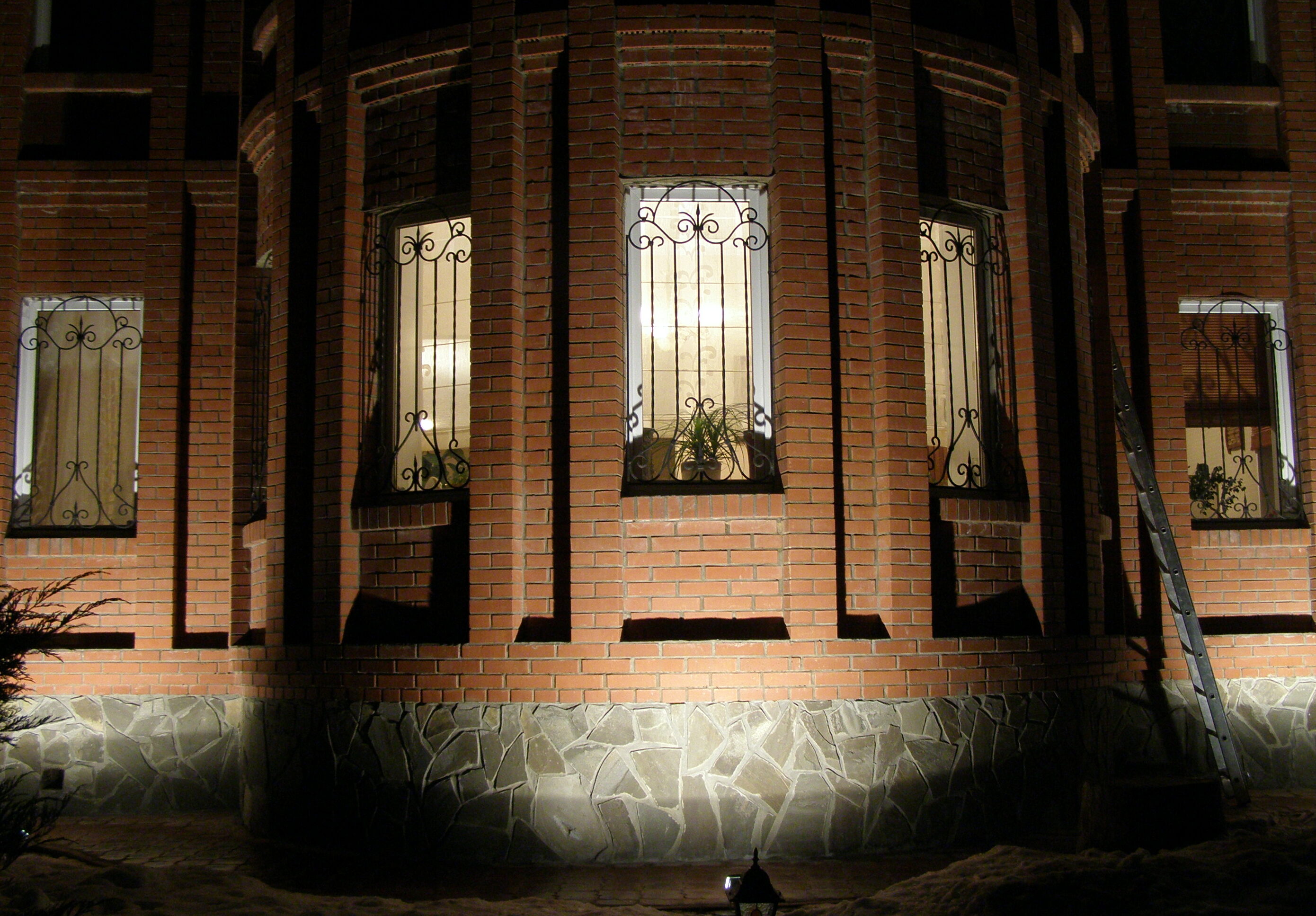 Для фронтального освещения фасадов домов используют прожекторы направленного и заливающего света. У первых используют узконаправленные пучки света, у других лучи расходятся на более широкий угол и охватывают большую площадь.