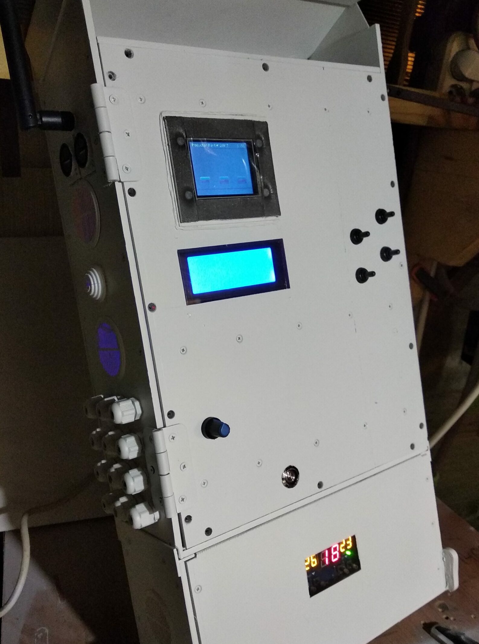 Установил всё, что надо на период обкатки и отладки. Предусмотрел даже охлаждение всех внутренностей от перегрева. Старший сын нашёл на Али простой контроллер для управления по температуре, и его я задействовал на эту функцию с помощью пяти маленьких вентиляторов.