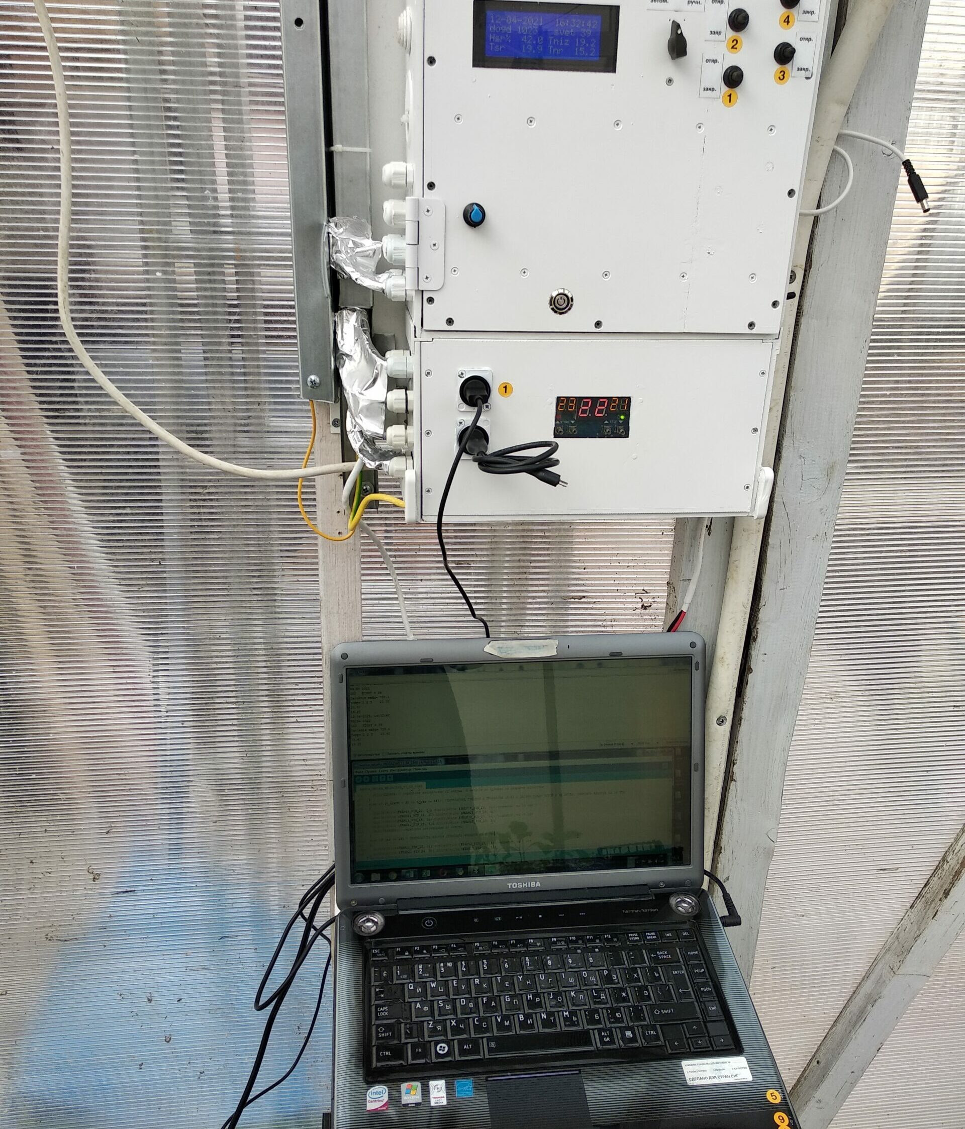 Это можно попытаться побороть с помощью экранирования и заземления всех цепей. Сейчас главное отладить алгоритм управления по основным параметрам – дождю, температуре и освещённости в разных сочетаниях. Стараюсь учесть все возможные комбинации. Ноутбук стоит в теплице и в мониторе серийного порта смотрю, что показывает программа, кроме того, что идёт на дисплей.