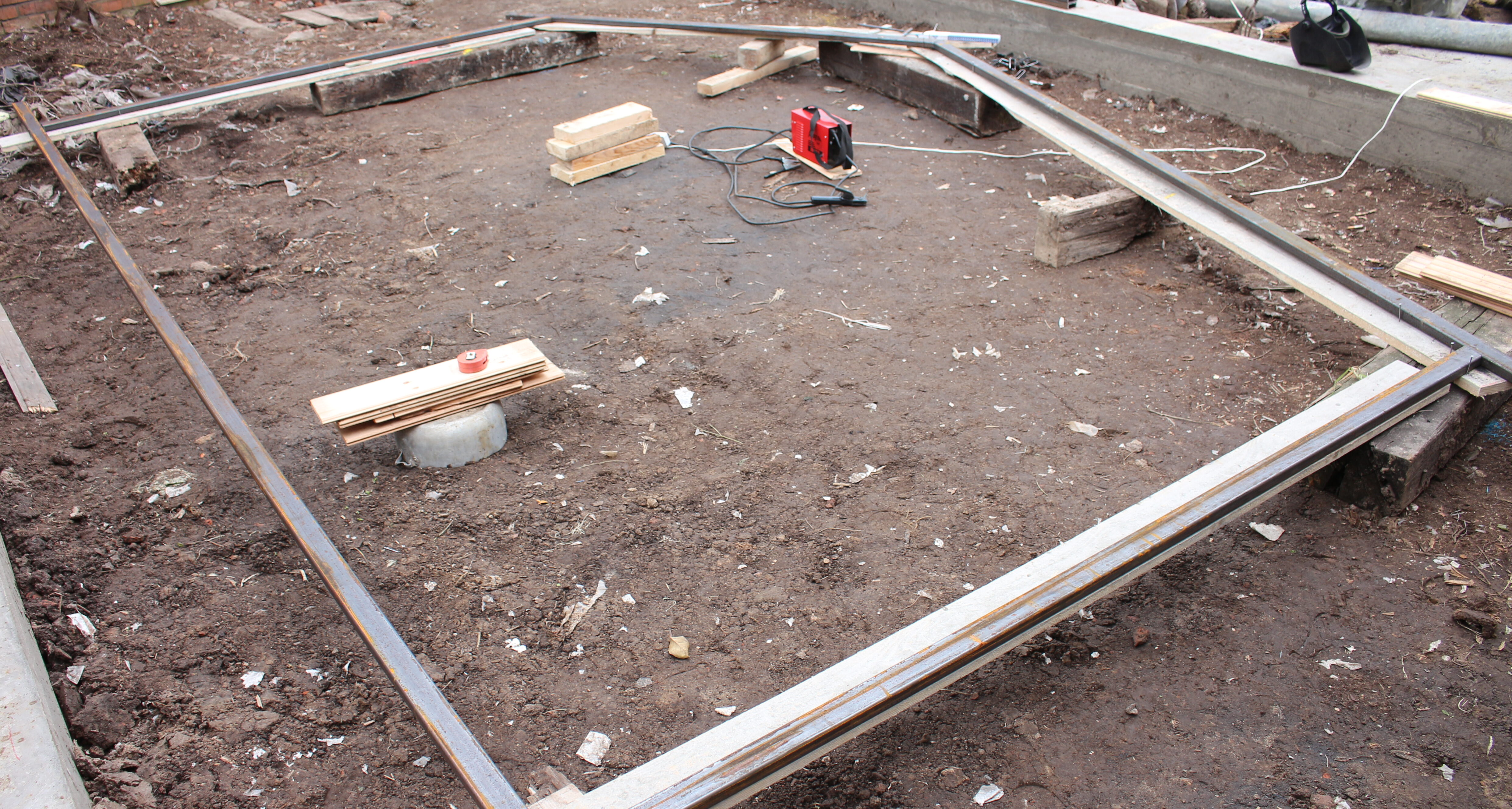 Изначально были замерены гараж и сарай, был измерен промежуток между ними и обозначен общий контур площадки. Эскиз теплицы прорисовывался на миллиметровке. Отдельные узлы рисовались в масштабе 1:1. К моменту начала основных работ по разметке и заготовке отдельных элементов конструкции был залит фундамент.