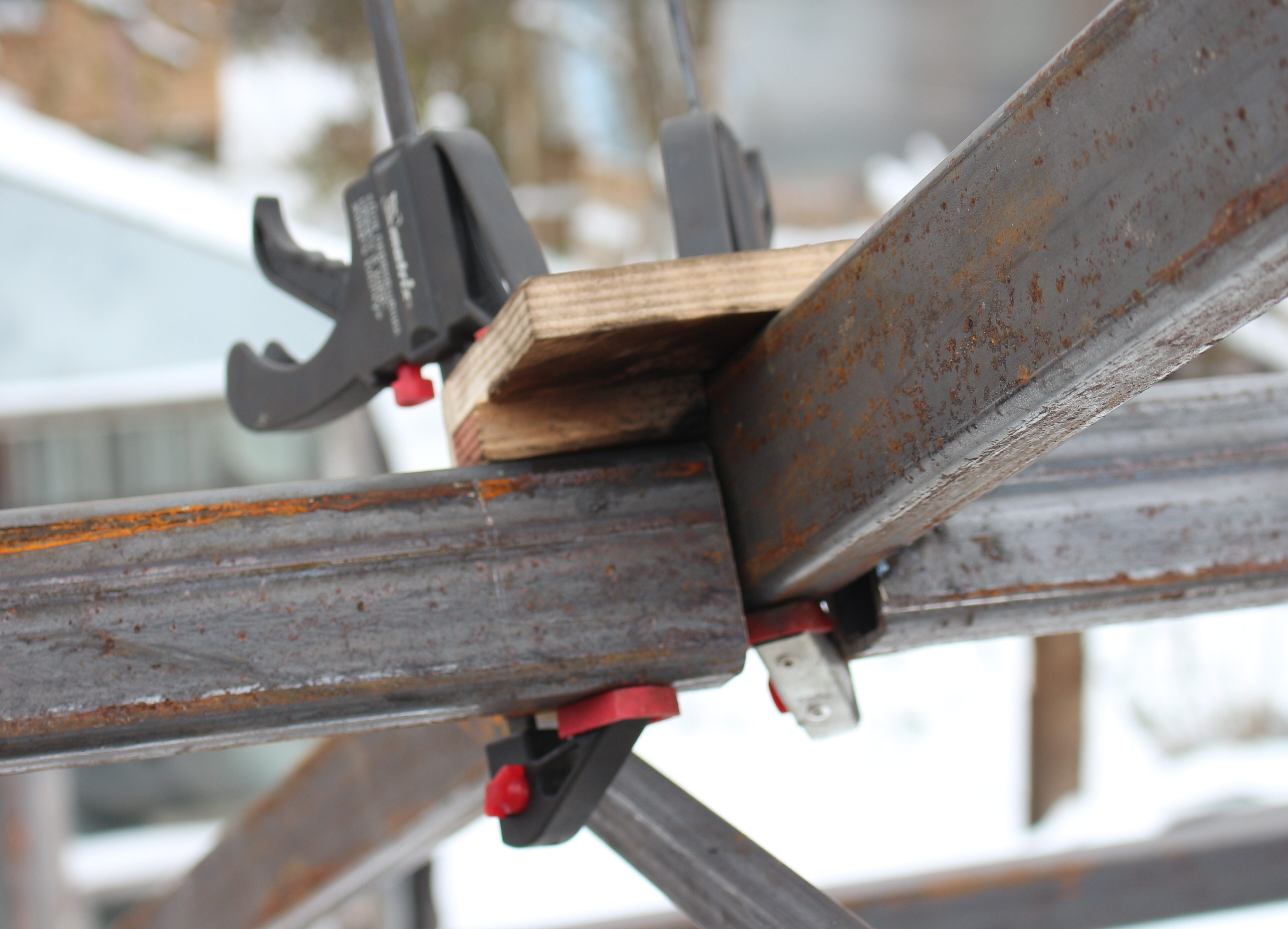 Законцовки элементов каркаса отрезались по трафаретам для каждой стороны. Затем был сделан кондуктор из подручных материалов по размерам будущей арки для фиксирования её элементов на время сварки.
