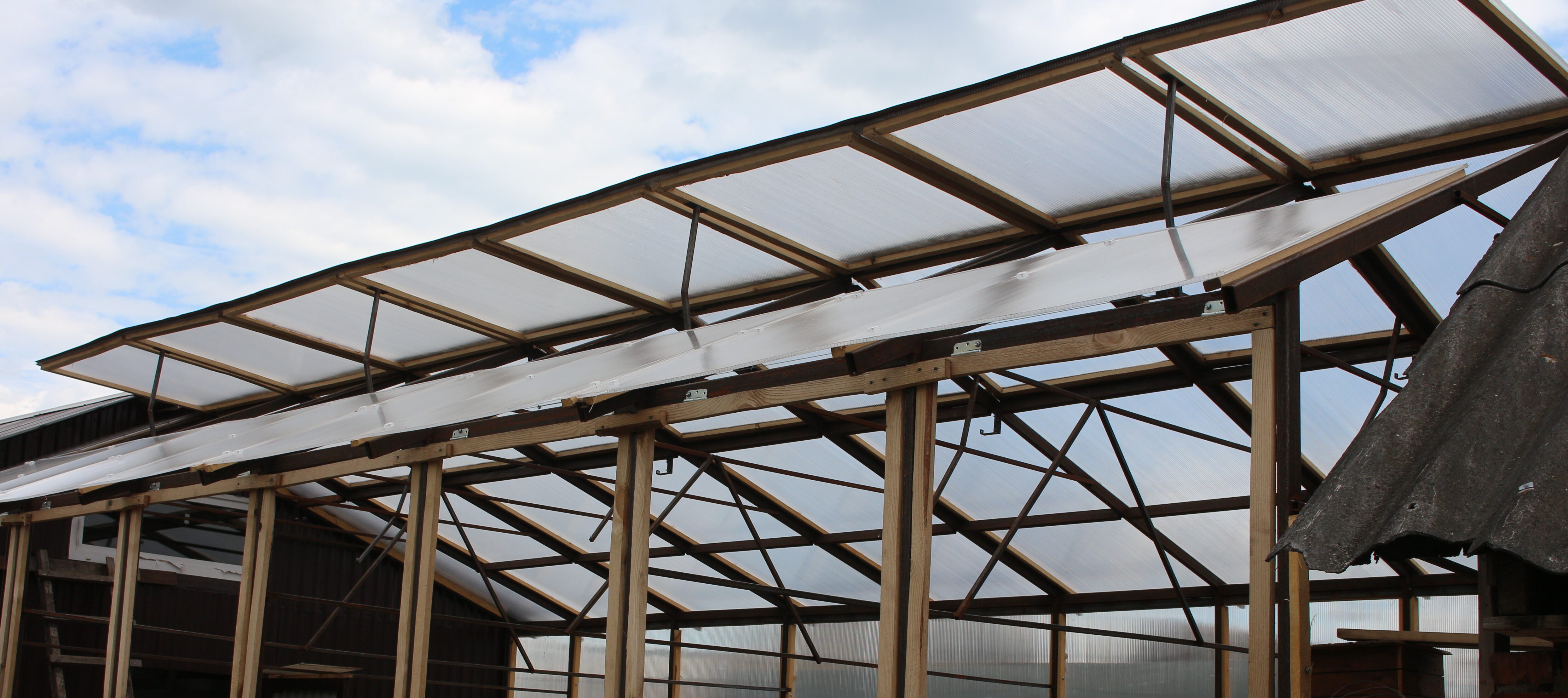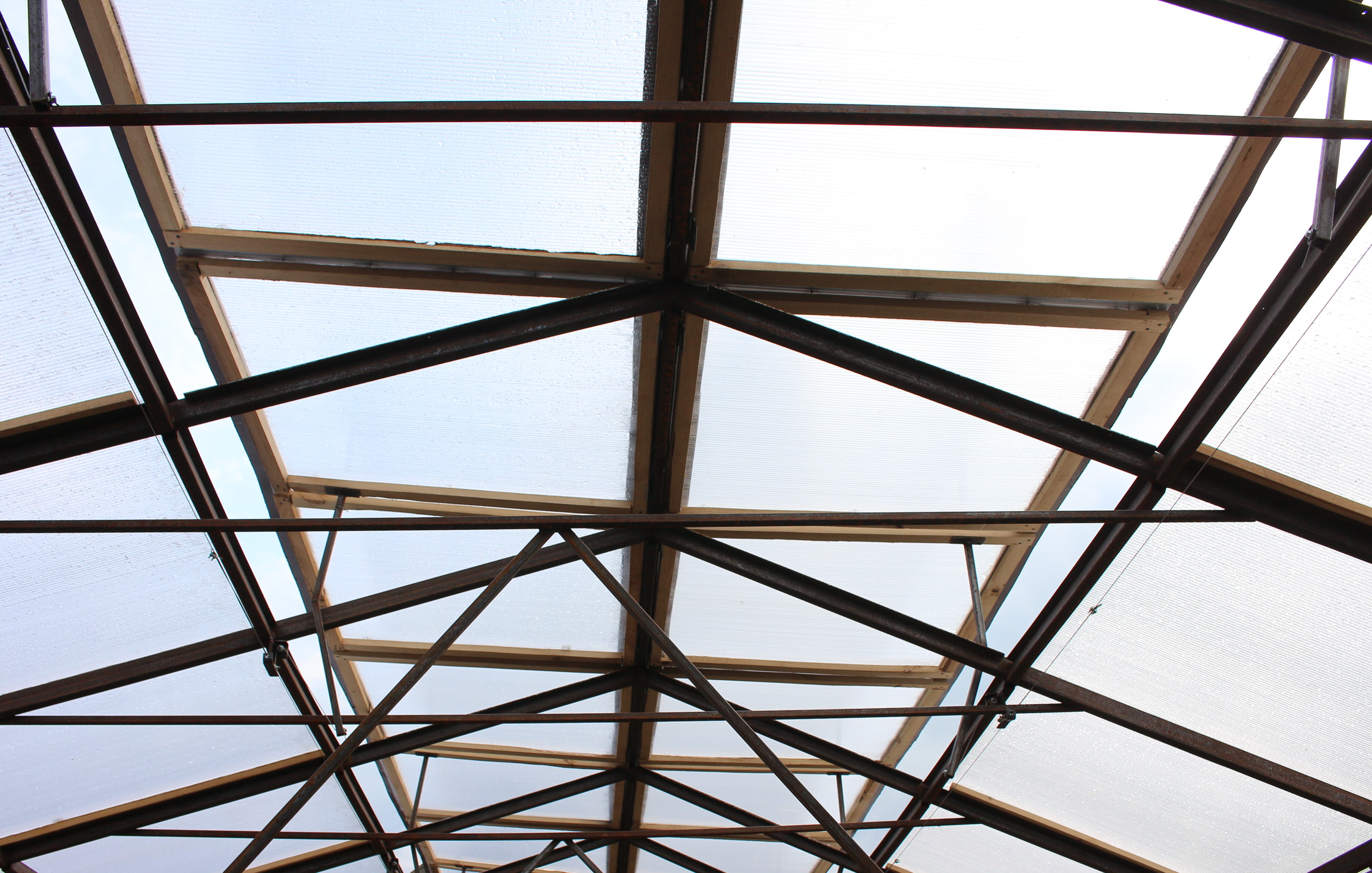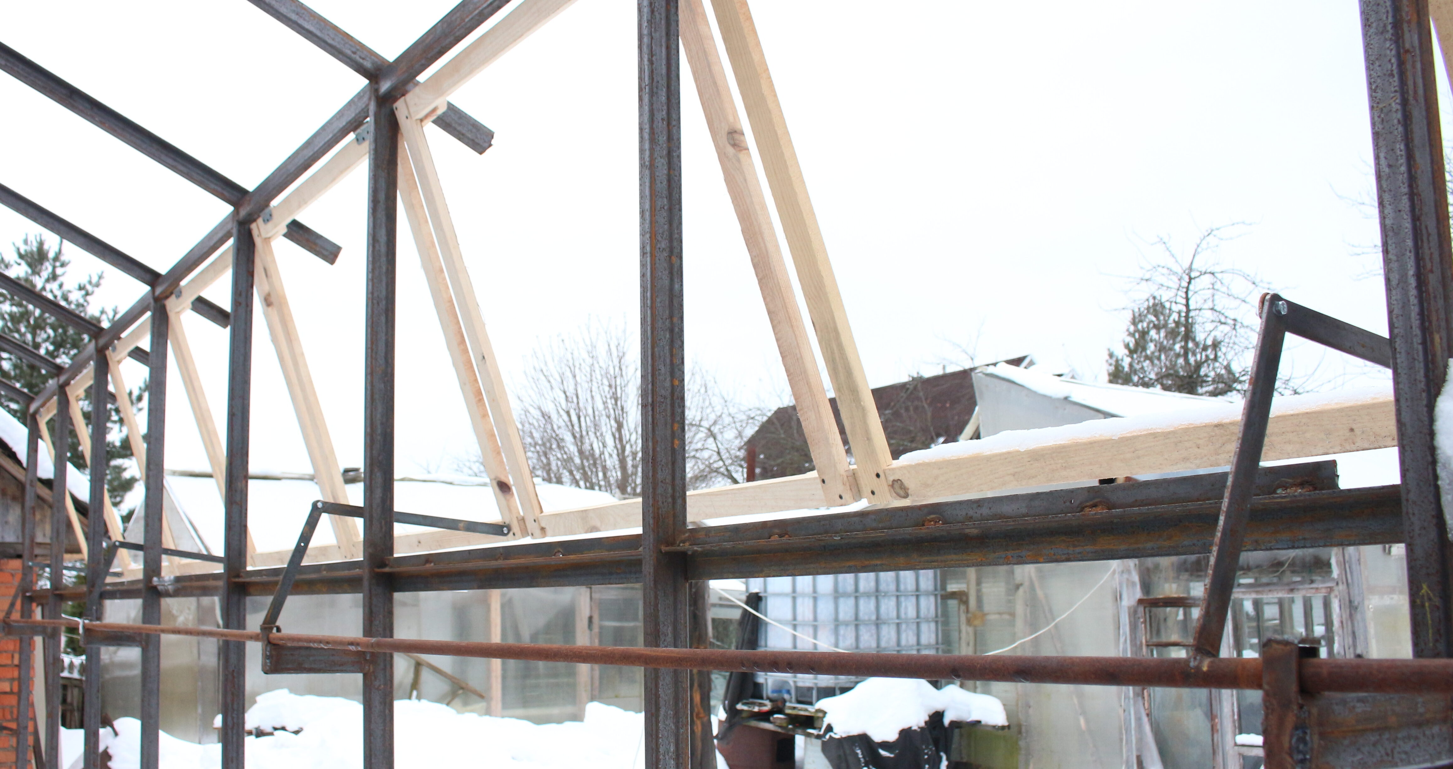 Арки ставились на место тремя работниками и удерживались, пока один приваривал низ стоек к анкерным элементам. Для фиксации прогонов на ригелях были придуманы специальные упоры, которые крепились струбцинами к каркасу в определённых местах. На ригели приваривалась полоса с отверстиями для крепления к ней реек под поликарбонат.