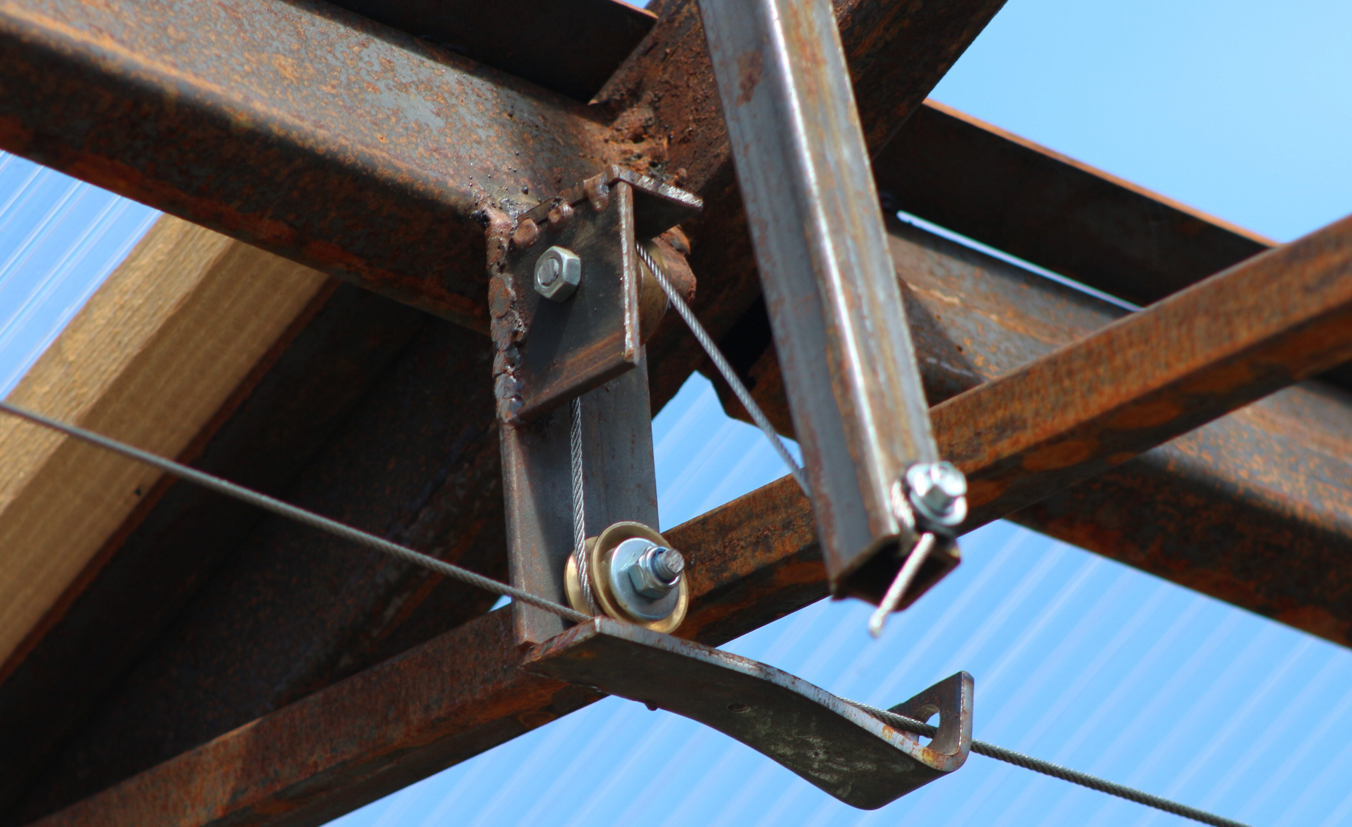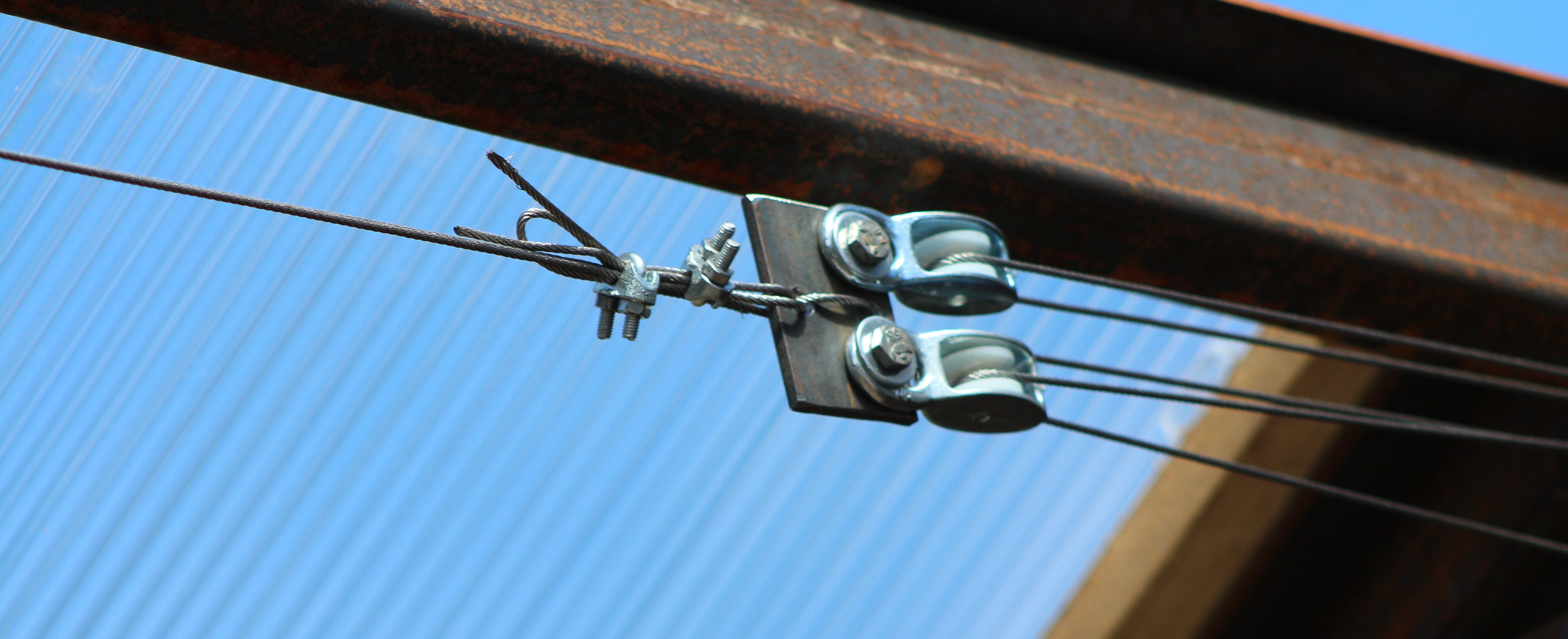 Сами кронштейны приваривались к верхним прогонам в определённых местах для обеспечения равномерного усилия при открывании фрамуг. Тросик передавал усилие через рейку длиной 70 см из трубы 20×20 мм, закреплённой в нижней части рамы. Усилие же на тросик для открывания фрамуги шло через полиспаст с небольшим запасом троса от катушки, установленной на стенке гаража.