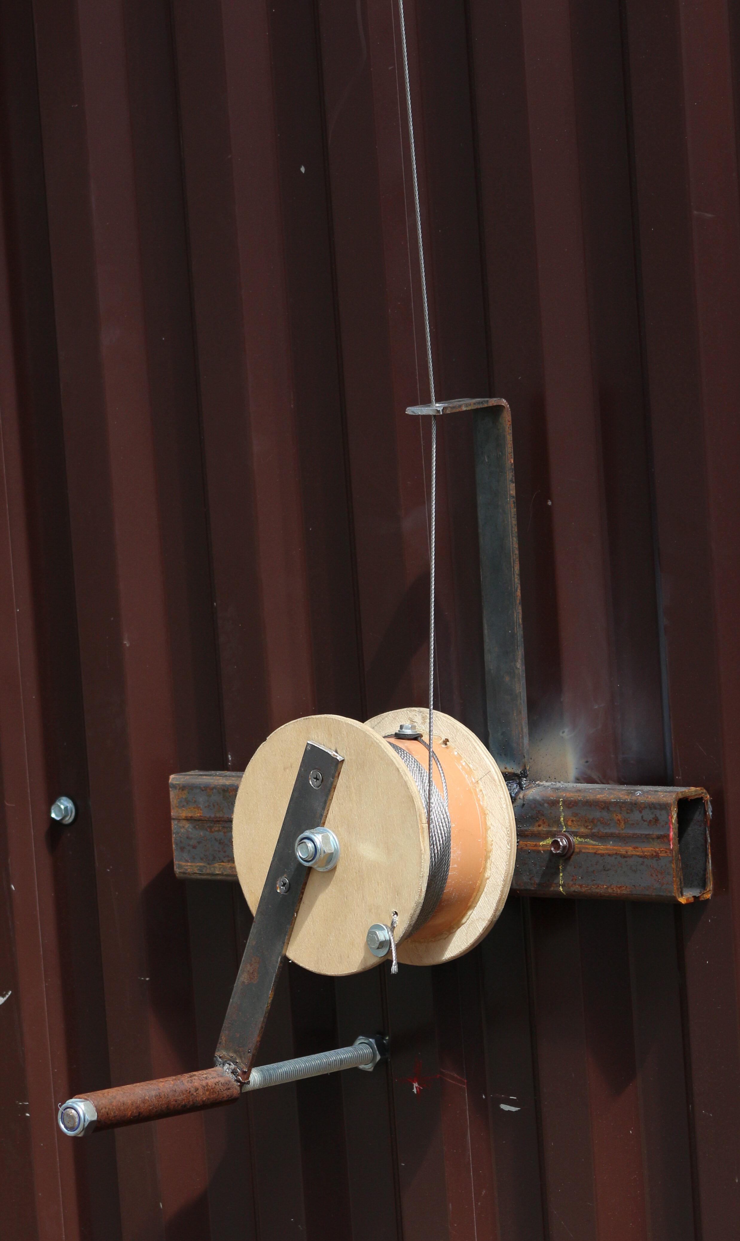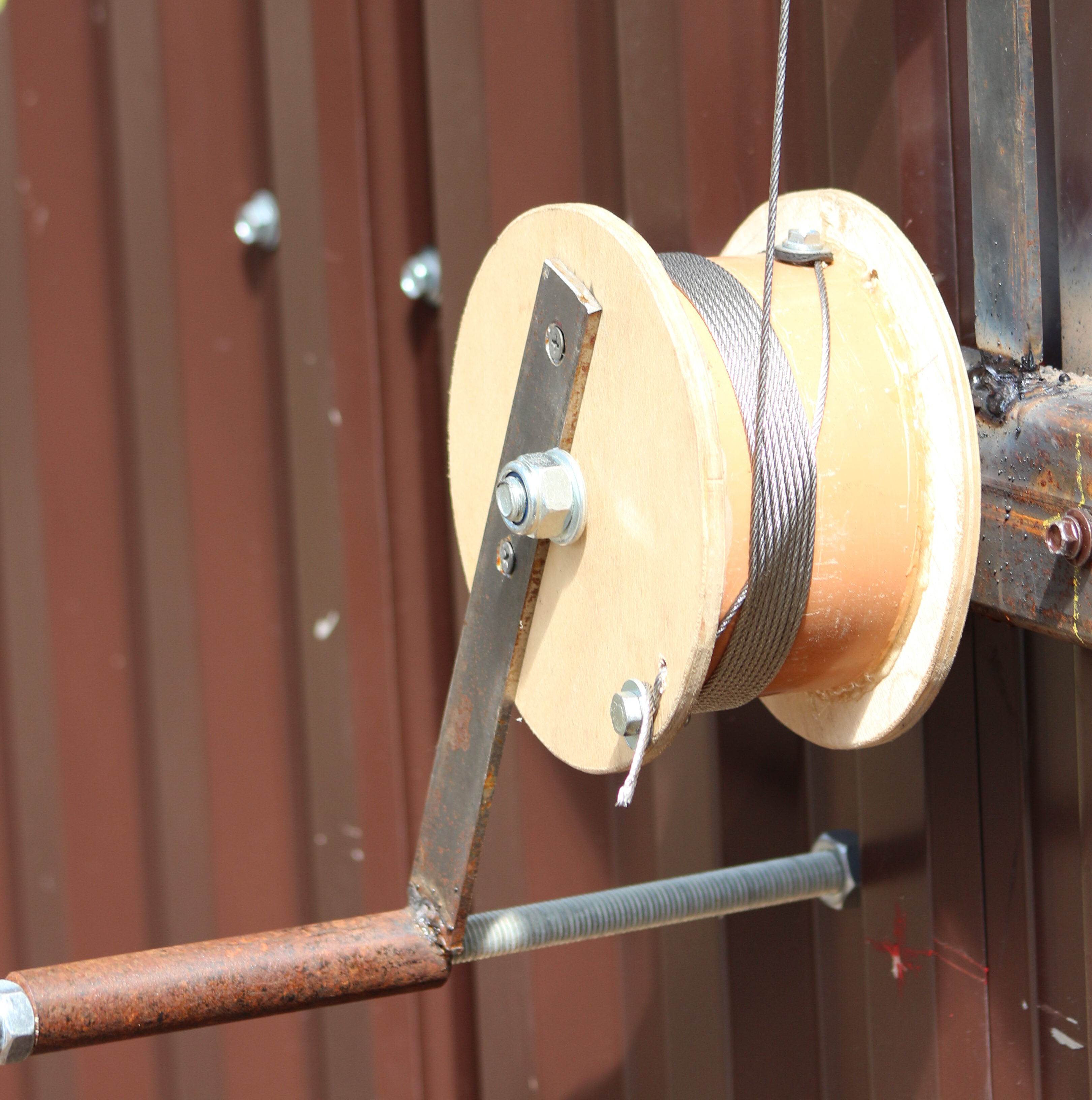 Ось проходила через стенку гаража в местах элементов жёсткости каркаса. На боковой стороне катушки была закреплена ручка из полосы 25 мм и отрезка трубы ½". В ручке также был стопор для промежуточных позиций.