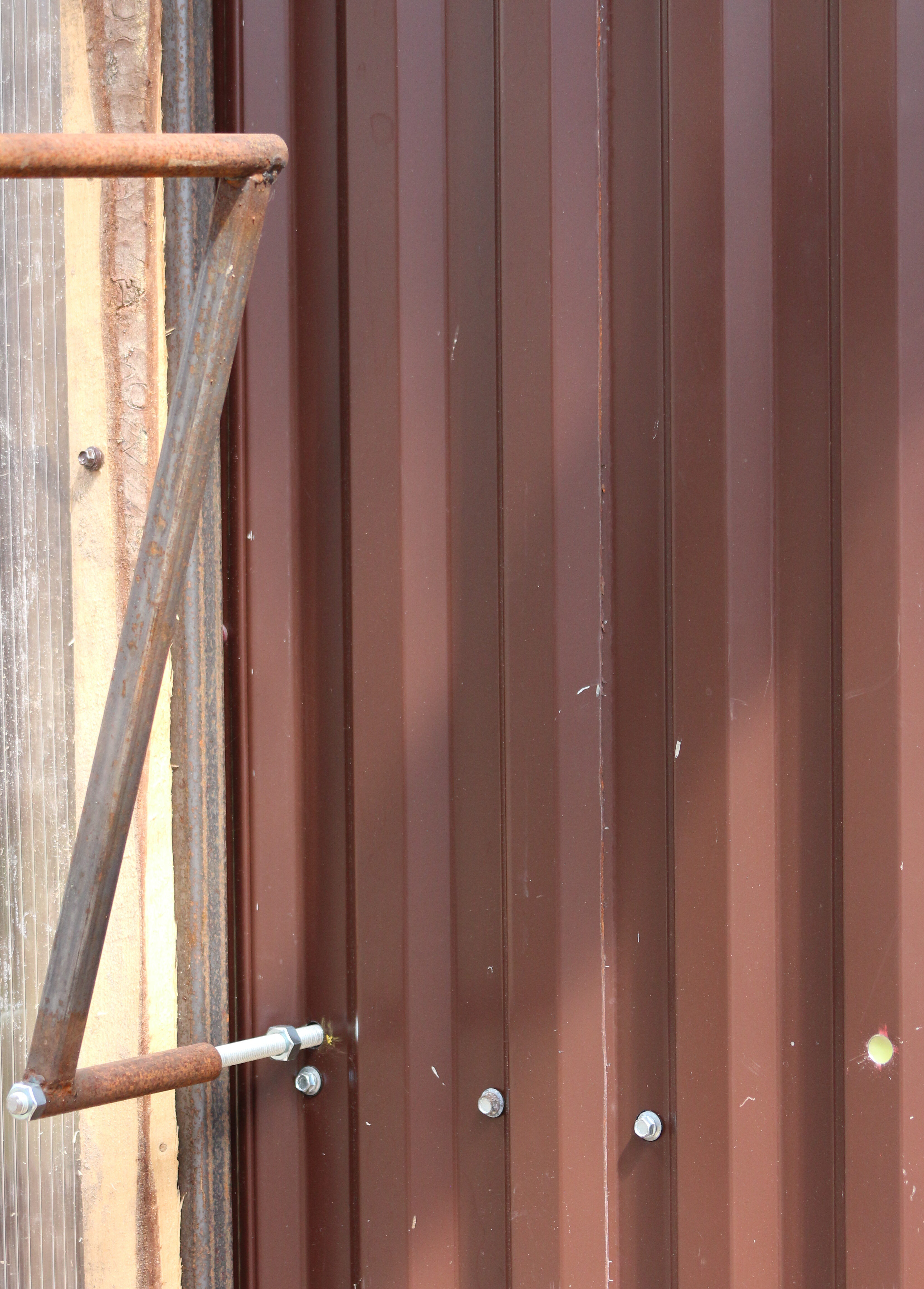 Боковая фрамуга (с одной стороны теплицы) открывалась при помощи одного рычага на всю длину теплицы. К форточкам крепились толкатели из полосы 25×4 мм, приваренной к длинной водопроводной трубе ½". В торце теплицы (у гаража) к трубе был приварен рычаг с ручкой и стопором для фиксирования отдельных позиций открытия. Сама труба вращалась на горизонтальных кронштейнах, приваренных к стойкам на одной высоте от фундамента.