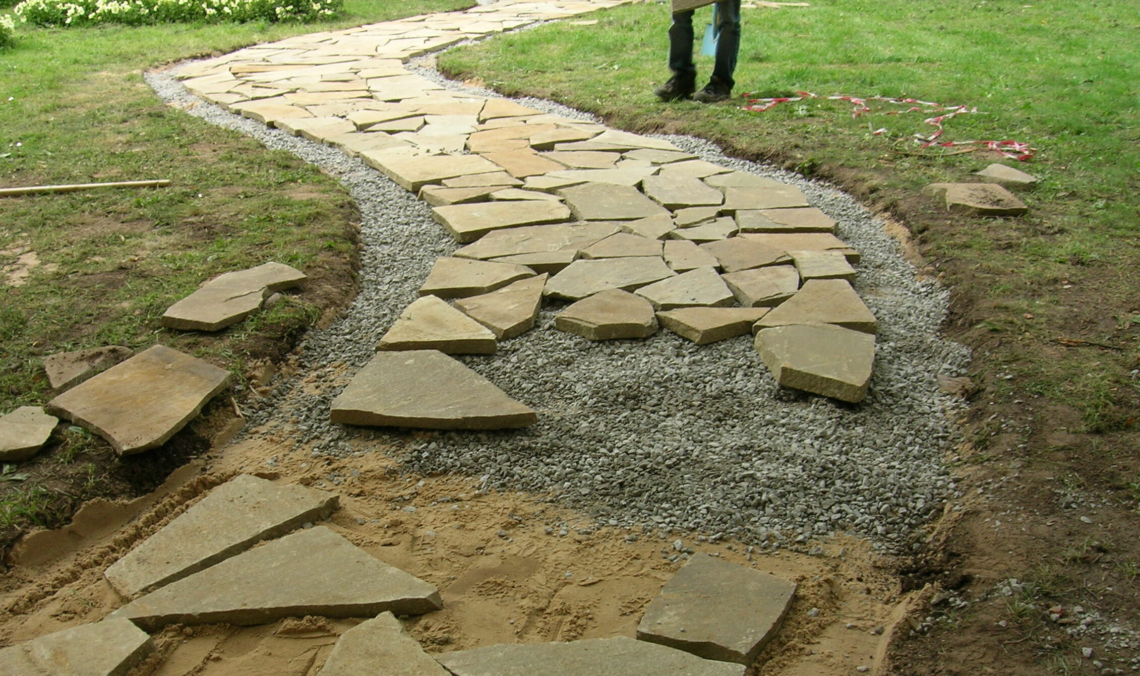 Плиты песчаника подбирают по размеру и конфигурации и укладывают с небольшими -1-2 см — зазорами между ними. В дальнейшем можно промежутки засыпать декоративными материалами или смесью почвы с семенами газонной травы. Газон прорастёт и его дернина укрепит камни от расползания по полотну. Края такой дорожки можно укрепить таким же способом – смесь земли с семенами, или подойти к полотну рулонным газоном с прирезкой краёв по форме камней.