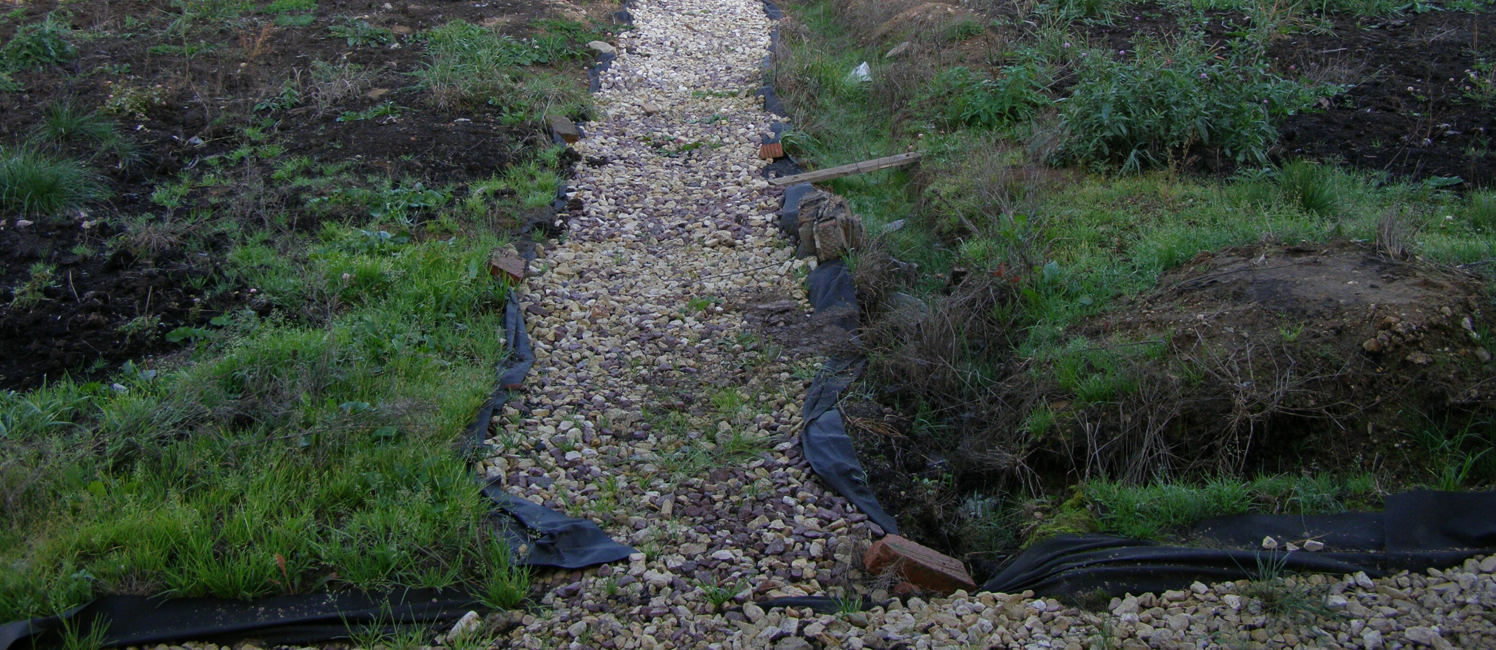 После разметки откапываем плоскую траншею под полотно. Она будет немного шире чем декоративное покрытие, для укладки вдоль него дренажа и установки бордюрных камней. Бордюры нужны только для удержания полотна в заданных размерах для каменных, кирпичных, плиточных и насыпных полотен. Лёгкие дорожки, без основы, могут быть без бордюров, с естественными границами из газона или другого декоративного обрамления.