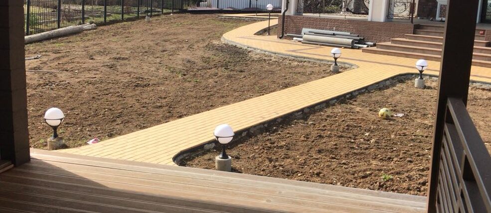 Для получения отличного результата, для долговременного использования дорожек надо правильно начать все работы. Первым пунктом идёт разметка дорожки и её направления. Это делается при помощи колышков из дерева. Они вбиваются с обеих сторон дорожки на ширину полотна.