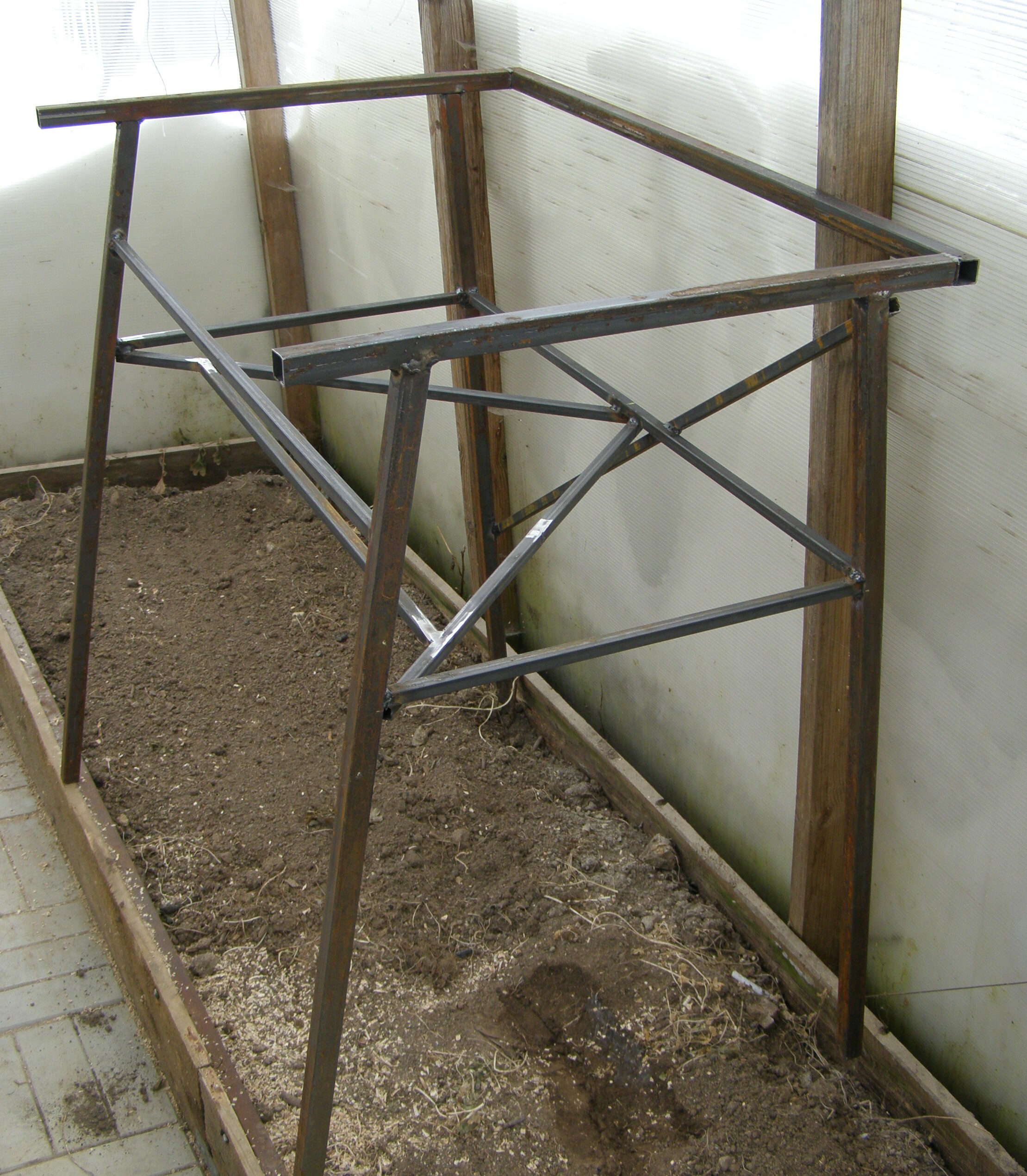 За четыре года эксплуатации удалось расширить внутреннее пространство своей маленькой мастерской с помощью новых полок. К ним сварил настенные кронштейны, добавил несколько кронштейнов для складирования досок. Дополнительно поменял оснастку высоких грядок в теплице – теперь рамы боковин из квадратной трубы, и обшиты досками. Изготовил несколько подставок для цветов и балконных ящиков.