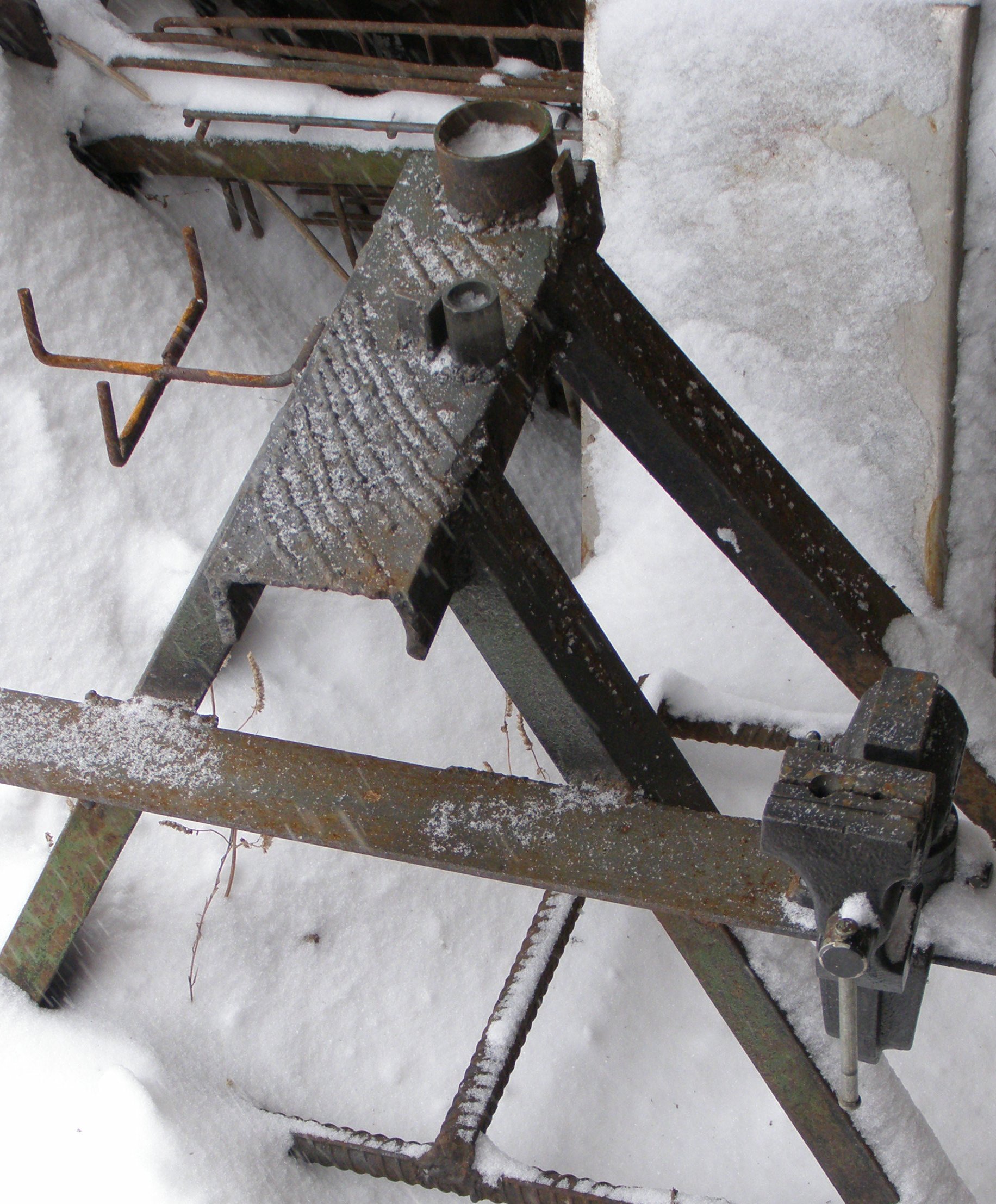 Для изготовления фигурных деталей приспособил подставку из толстого уголка и швеллера. Закрепил на ней тиски и приварил несколько обрезков труб разного диаметра с упорами. Теперь в этих приспособлениях можно гнуть из толстой проволоки и полосы различные элементы для декоративных изделий.