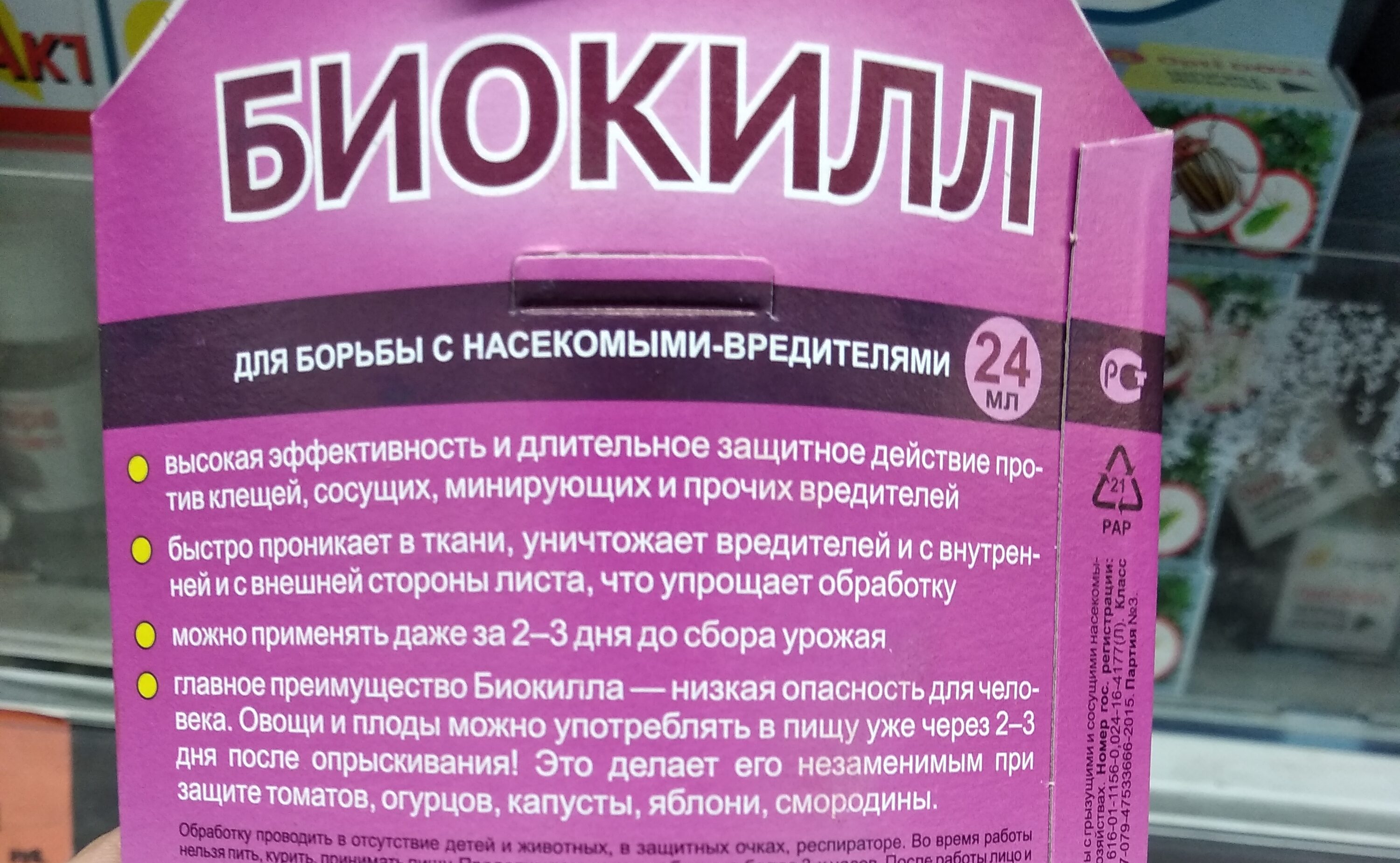 Из распространённых инсектицидов – «Актеллик», действующее вещество средства «Актеллик» – пиримифос-метил (500 г/л), 2 мл ампулы на 2 литра воды.