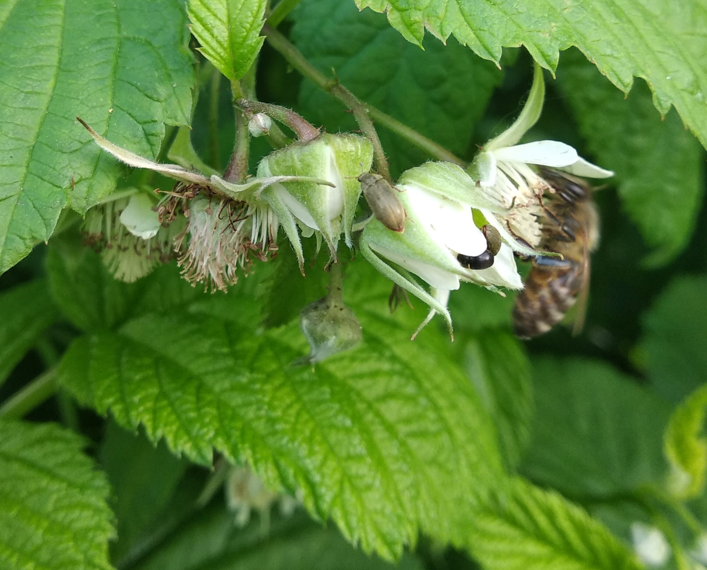 Много малинного жука, который появился в течение одних суток на плантациях малины и заселил её очень плотно.